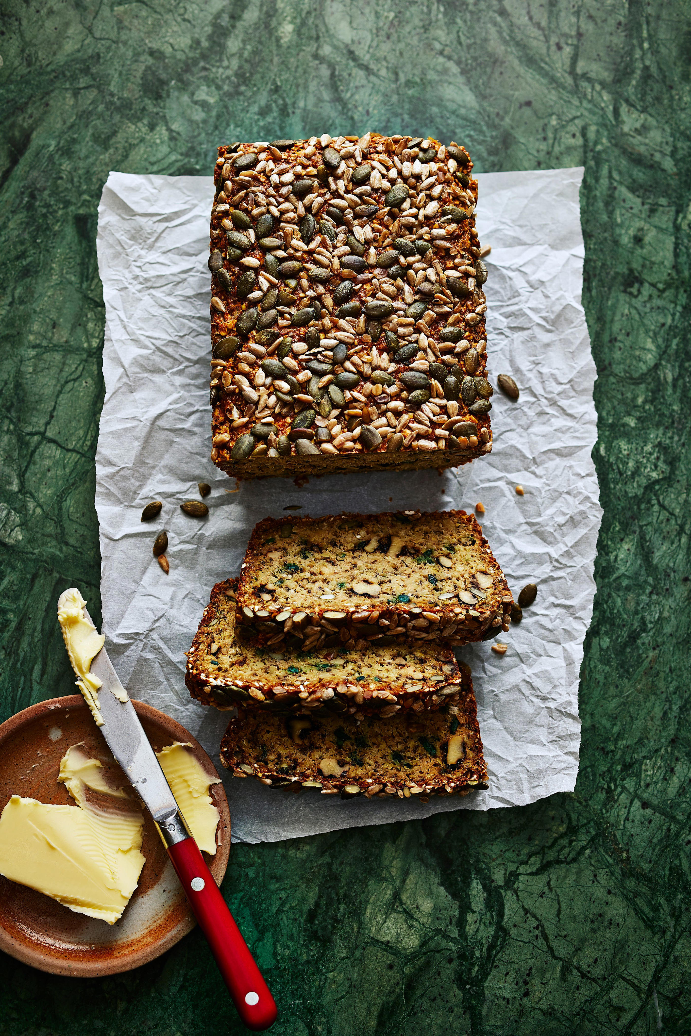 3. Pindahkan adonan ke loyang yang sudah disiapkan, ratakan dan taburi biji labu tambahan dan biji bunga matahari serta biji wijen di atasnya. Panggang di tengah oven selama 45 menit hingga berwarna cokelat keemasan.