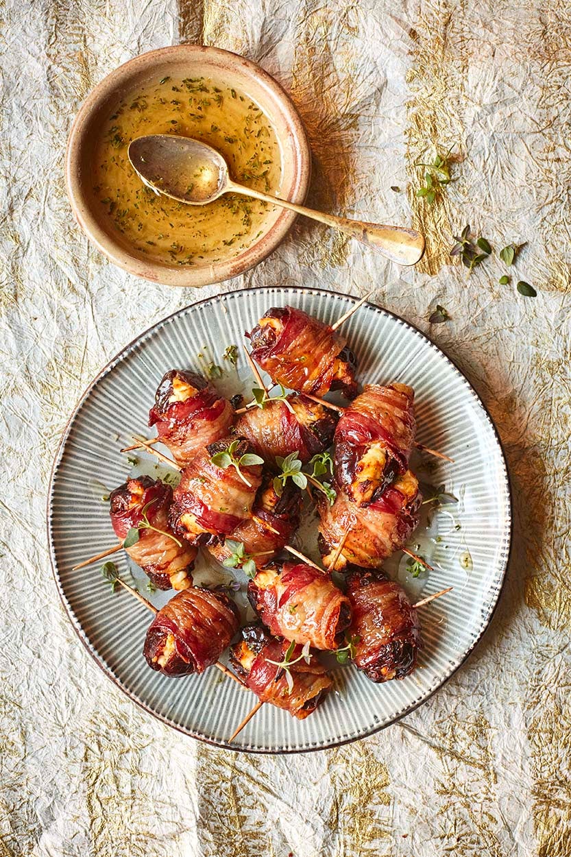 4. Oleskan sedikit madu lagi, lalu bungkus dengan irisan bacon berlemak. Gunakan tusuk gigi besar untuk menusuk tengah kurma, mengamankan semuanya bersamaan. Letakkan di atas loyang yang sudah ditutup kertas roti. Ulangi hingga Anda mendapatkan 12 kurma berisi feta yang dibungkus bacon, dengan jarak yang cukup.