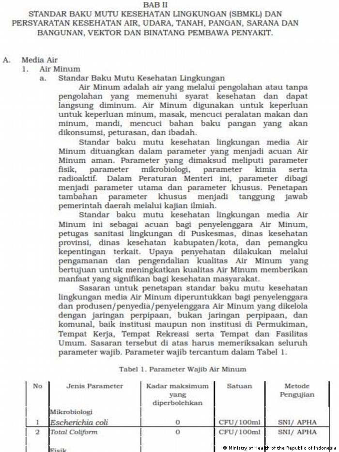 Permenkes ini menjadi acuan nasional dalam pengawasan kualitas air minum dan menjadi dasar pemerintah mengimbau masyarakat agar tidak mengonsumsi air yang belum melalui pengujian komprehensif. Regulasi tersebut juga memberikan definisi tegas mengenai air minum. Pada Pasal 1 Ayat 4, disebutkan bahwa ‘air minum adalah air yang melalui pengolahan atau tanpa pengolahan yang memenuhi syarat kesehatan dan dapat langsung diminum.’