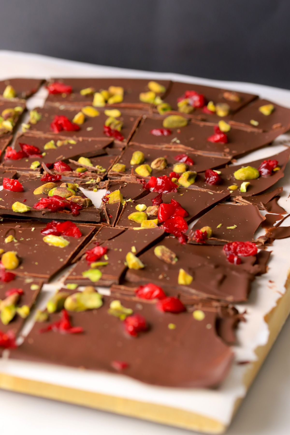 - Bark Cokelat Putih Kacang Pistachio Cranberry:Lebih lembut daripada cokelat hitam; mungkin membutuhkan hingga dua jam di dalam kulkas. Cranberry merah cerah dan pistachio hijau membuatnya sempurna untuk hadiah liburan.