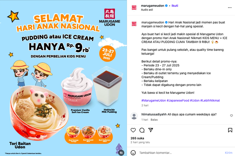 Marugame Udon membagikan gratis Kake Udon untuk setiap pembelian menu Hambagu & Cheese Curry Udon atau Rice menu. Promo ini berlaku 10–12 November 2025 untuk dine-in maupun takeaway di semua outlet.