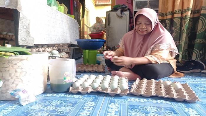 Setiap hari selama bulan Agustus, ritual kuliner yang rumit dilakukan oleh Cek Noni dan suaminya, Zainal Abidin (59). Proses pembuatannya dimulai dengan melubangi cangkang telur bebek, lalu isinya dikeluarkan dan diganti dengan adonan istimewa. Adonan tersebut dibuat dari telur bebek yang dikocok, ditambah sedikit kapur sirih untuk mendapatkan hasil yang optimal, serta pewarna alami dari jus pandan dan daun suji.