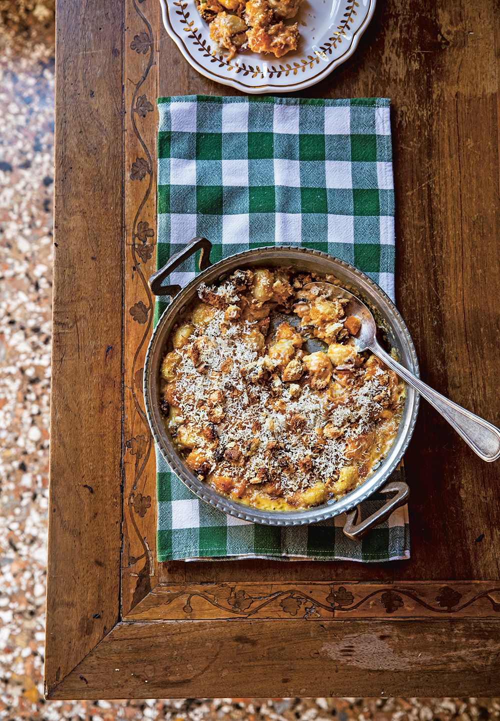 Matikan api, tambahkan gnocchi, krim dan cheddar, lalu aduk rata. (Jika panci Anda tidak tahan oven, pindahkan semua bahan ke loyang panggang pada titik ini.) Hancurkan panettone di atas panci dan taburi dengan parmesan. Tutup dengan foil. Pada titik ini, Anda dapat mendinginkannya hingga suhu ruang, lalu tutup dan simpan di kulkas selama maksimal 2 hari sebelum dipanggang.