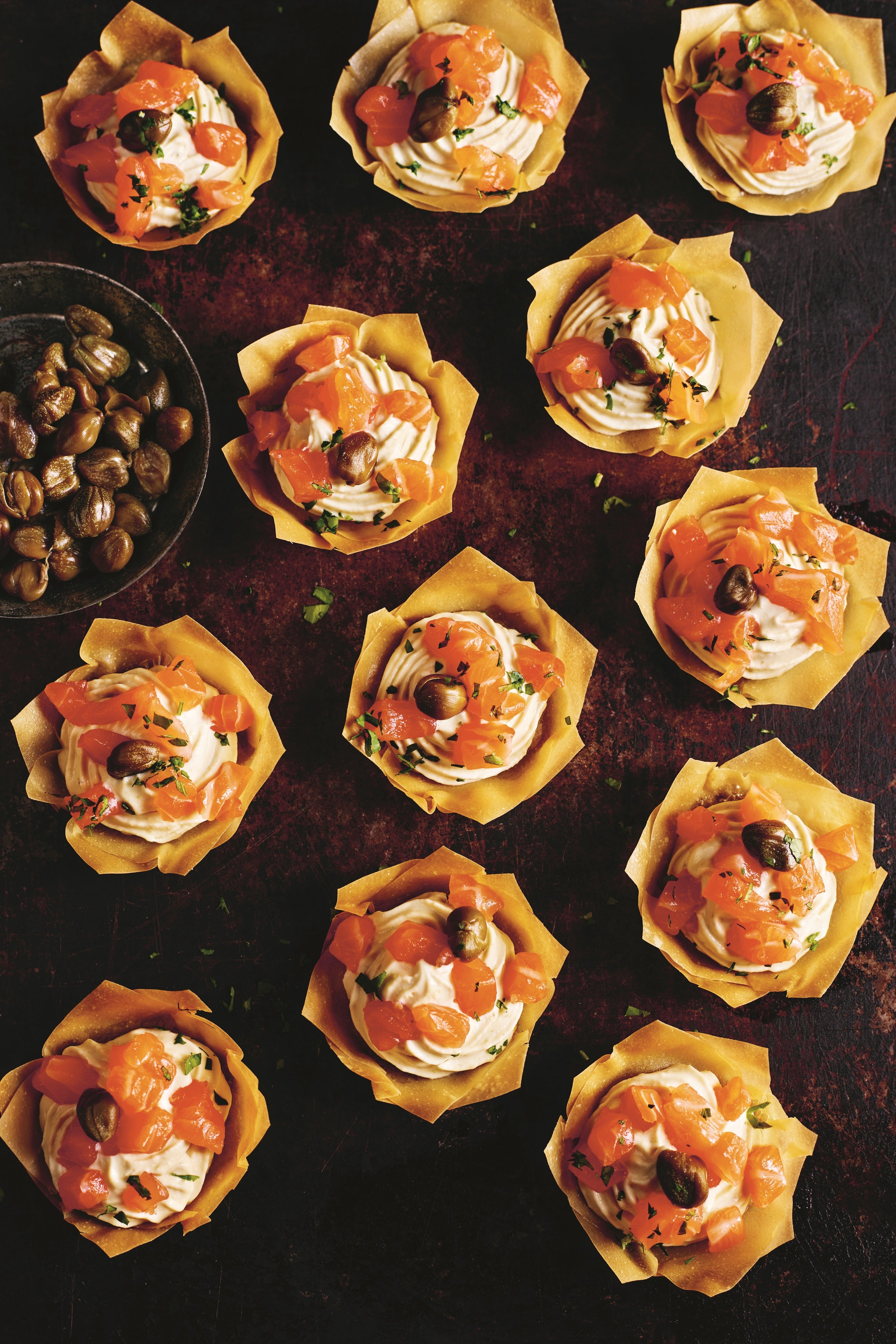 5. Sekitar 30 menit (atau kurang) sebelum disajikan, potong salmon menjadi potongan kecil. Sendokkan atau semprotkan satu sendok teh krim ke dalam setiap cangkir filo, lalu beri dengan potongan salmon, sebuah kapre, dan taburan garam laut.