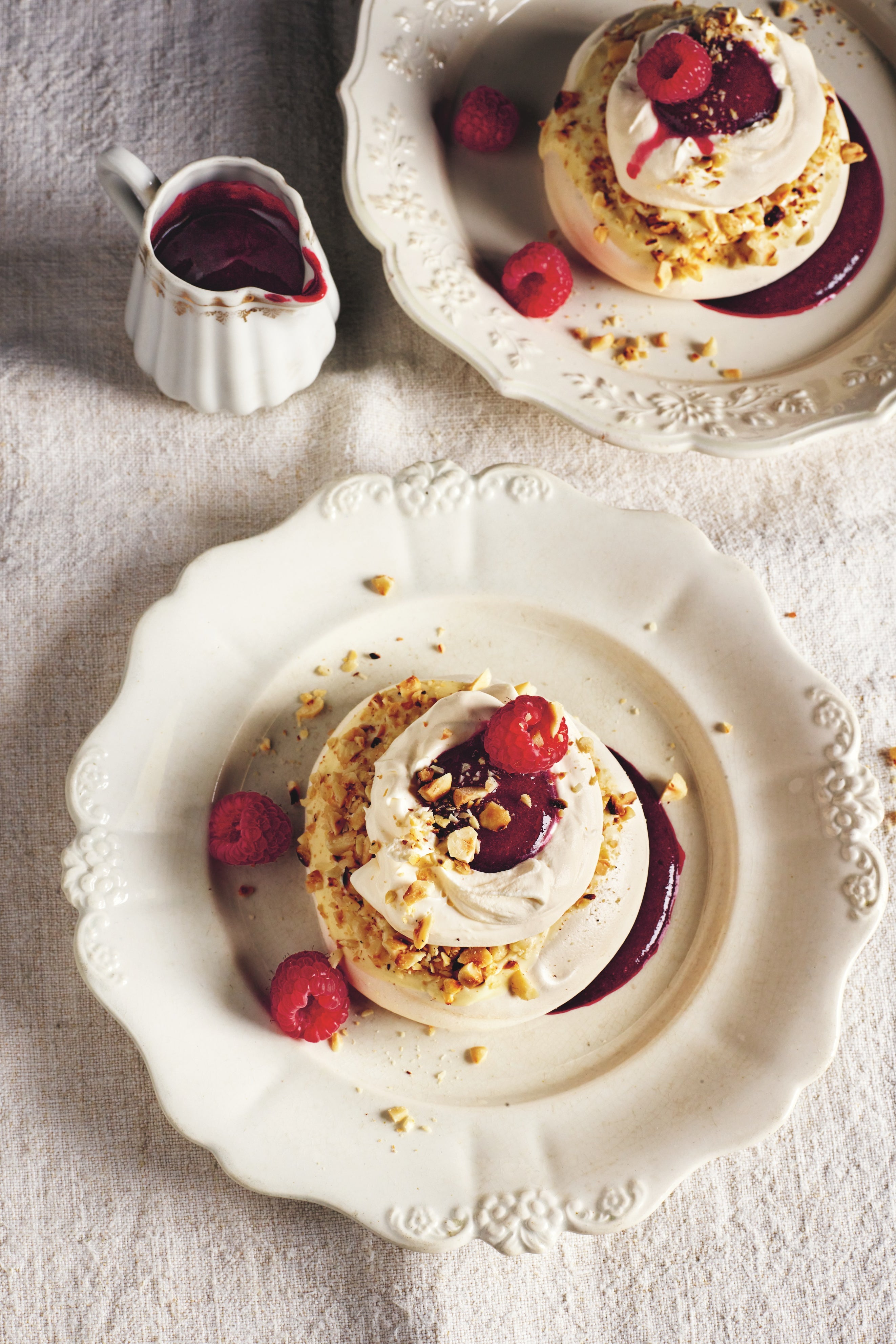 Pavlova kacang hazelnut dengan cokelat putih dan saus berry gelap