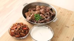 Sisihkan daging ayam, tahu, telur, dan tempe ke dalam mangkuk. Masak lagi nangka selama 5 menit saja. Nasi gudeg siap dihidangkan.