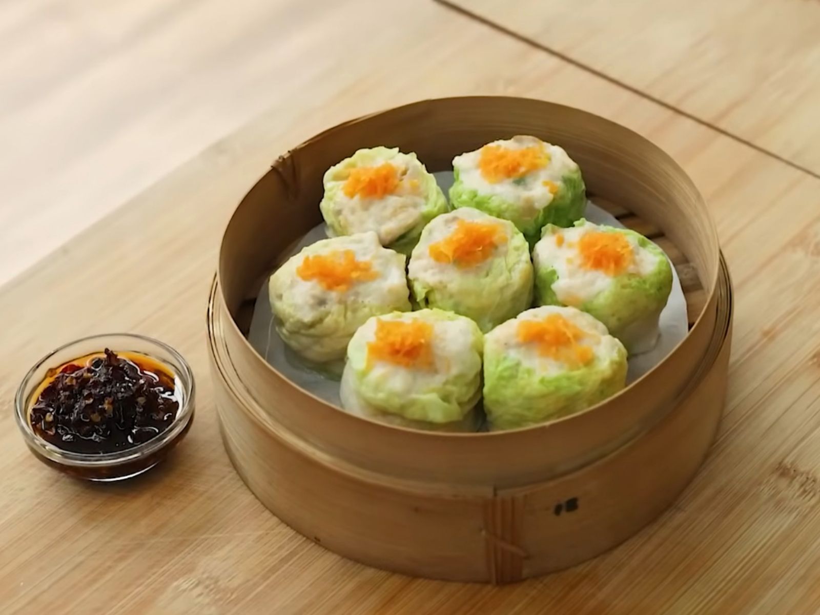 - Letakkan adonan di atas sawi, lalu gulung membentuk siomay. Atur parutan wortel di atasnya.