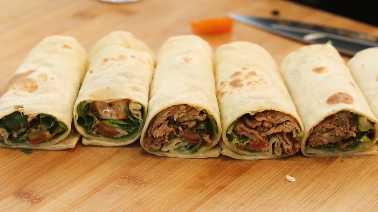 Letakkan isian sesuai selera: shish kebab, adana kebab, atau doner kebab. Tambahkan romaine lettuce, tomat, bawang bombai, daun ketumbar, serta saus (hot sauce, barbecue, dan mayonnaise). Gulung tortilla rapat agar isi tidak tumpah.