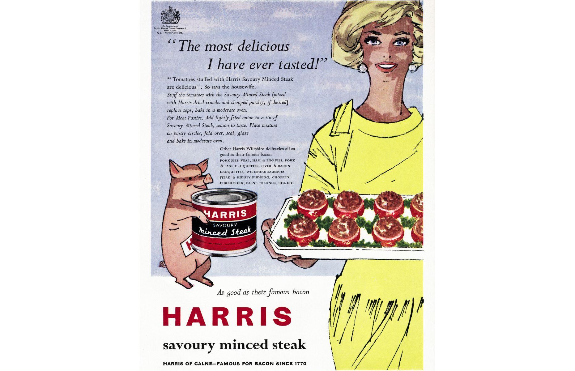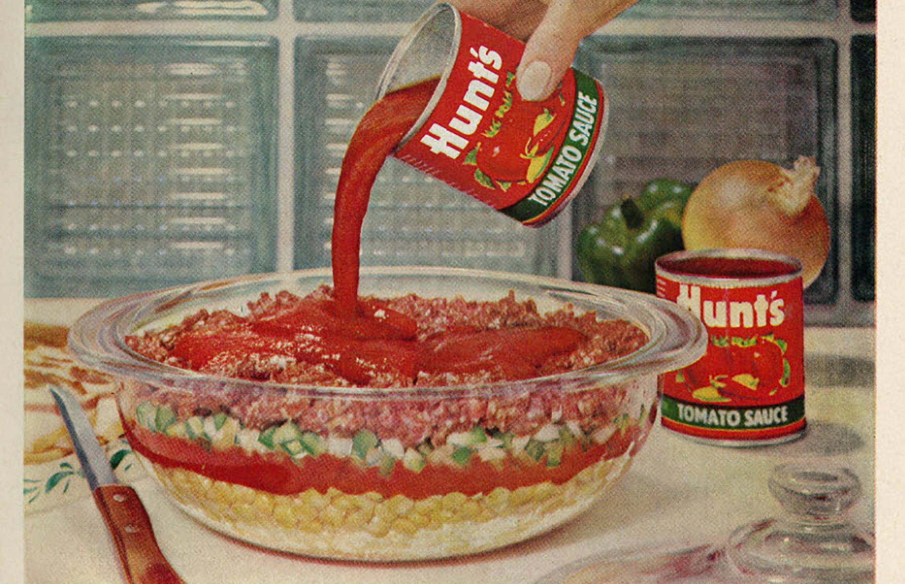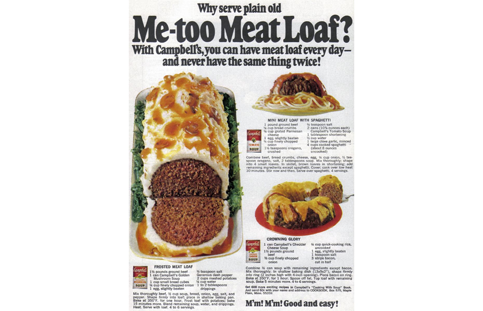 Pada akhir tahun 1960-an, Campbell’s menyarankan tiga (sangat menakutkan) cara baru untuk menyajikan daging giling. Para ibu rumah tangga didorong untuk mencoba mengolesinya dengan kentang tumbuk dan sedikit sup jamur, membentuknya menjadi bola daging raksasa yang disajikan di atas spaghetti dengan sup tomat, atau – mungkin yang paling menyeramkan – dibentuk seperti kue bundt dan dilapisi dengan sup keju. Iklan kuno ini diterbitkan padaGood Housekeepingpada tahun 1969.