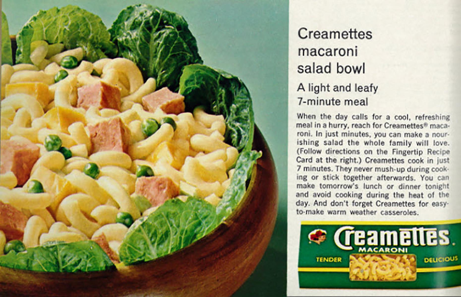 Salad tahun 1960-an lainnya yang hanya bisa dijelaskan secara umum, Creamettes macaroni salad bowl dipasarkan sebagai “makanan ringan dan berdaun dalam waktu 7 menit”. Resep ini dilengkapi dengan bahan-bahan seperti SPAM, minyak salad, mayones, makaroni, dan Cheddar. Mungkin merek pasta Amerika itu berpikir mereka bisa menipu konsumen dengan gambar yang setengah layak, tetapi hasilnya kurang ringan dan berdaun, melainkan lebih mirip kekacauan dalam waktu tujuh menit.