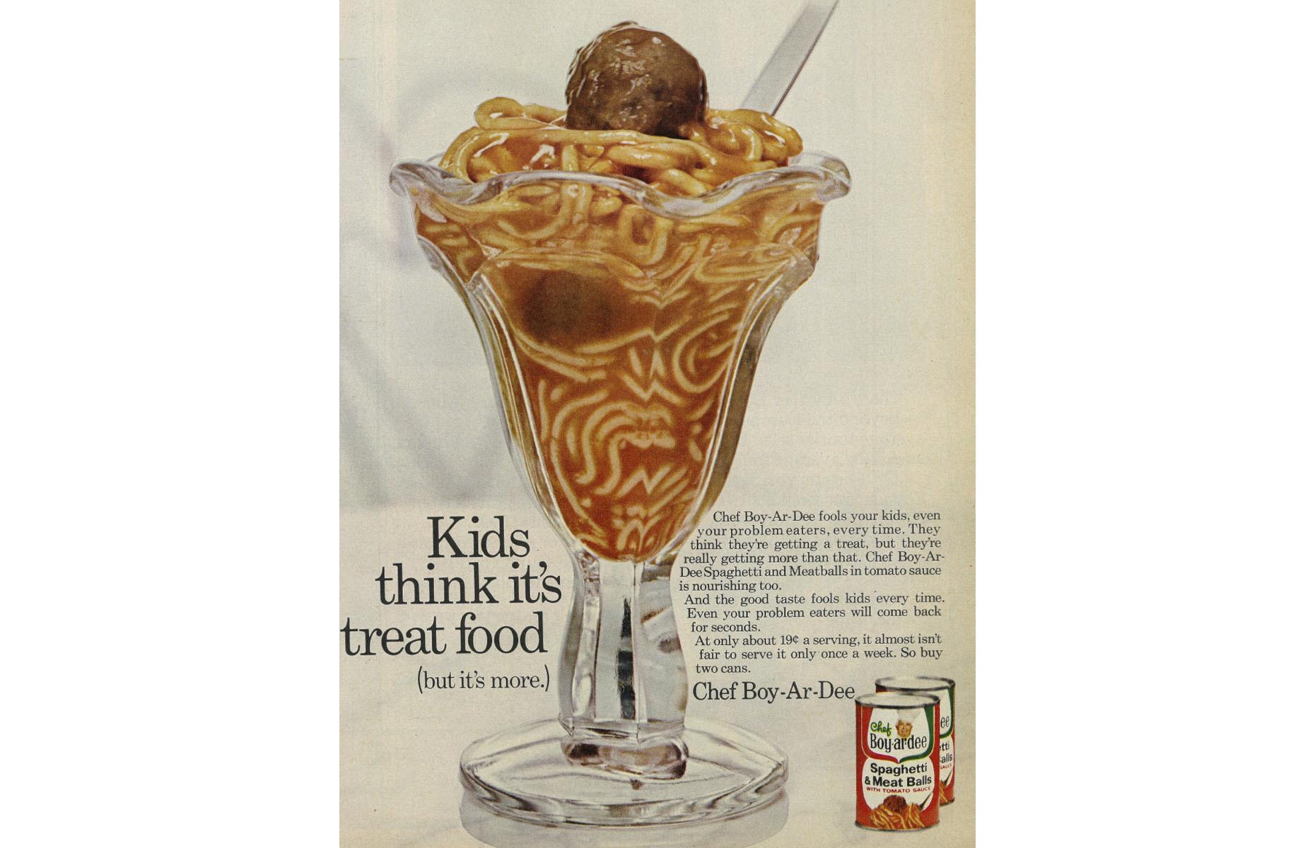 Sebuah hidangan gurih yang tampak seperti camilan manis kemungkinan besar tidak akan disukai anak-anak saat ini, tetapi Chef Boy-Ar-Dee cukup bangga dengan ilusi ini. Ia bersikeras bahwa anak-anak akan menyukai sundae daging spaghetti-nya – dan bahwa itu juga bergizi. Entah kaleng spaghetti dan meatball telah mengalami penurunan kualitas yang sangat besar sejak tahun 1970-an, atau iklan ini terlalu membanggakan diri.