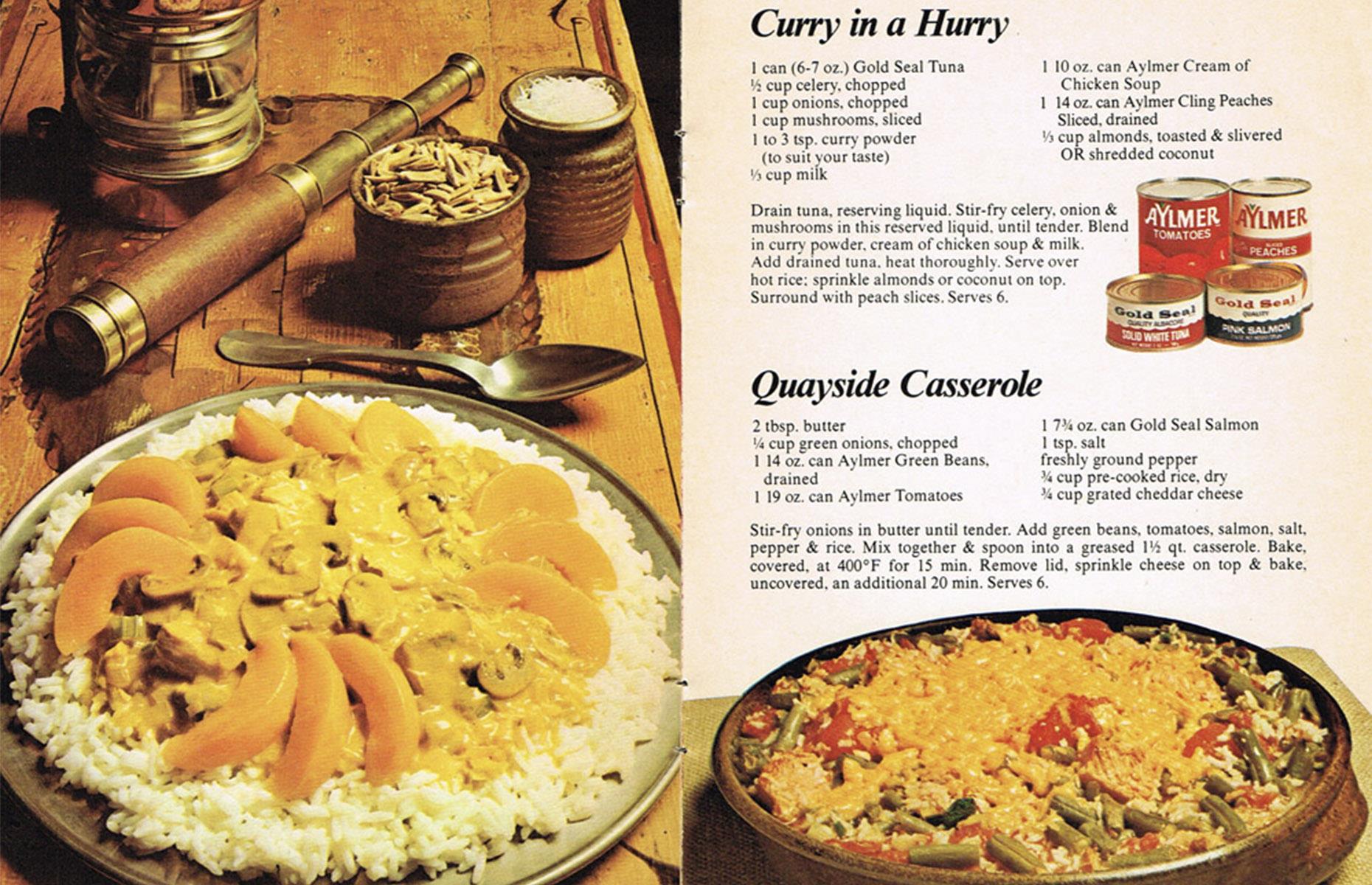 Dalam keadaan terburu-buru? Ambil jalan pintas (jika berani) dan buat masakan kari dalam waktu singkat dengan beberapa trik cepat dari makanan kaleng Aylmer dan Gold Seal, seperti yang dijelaskan dalam resep tahun 1970-an ini. Yang Anda butuhkan hanyalah tuna, sup ayam kemasan kaleng, irisan peach, jamur, bawang bombai, bubuk kari, almond – dan, kami bayangkan, perut baja. Tidak hanya terdengar menyeramkan, tetapi juga tidak menarik untuk dilihat.