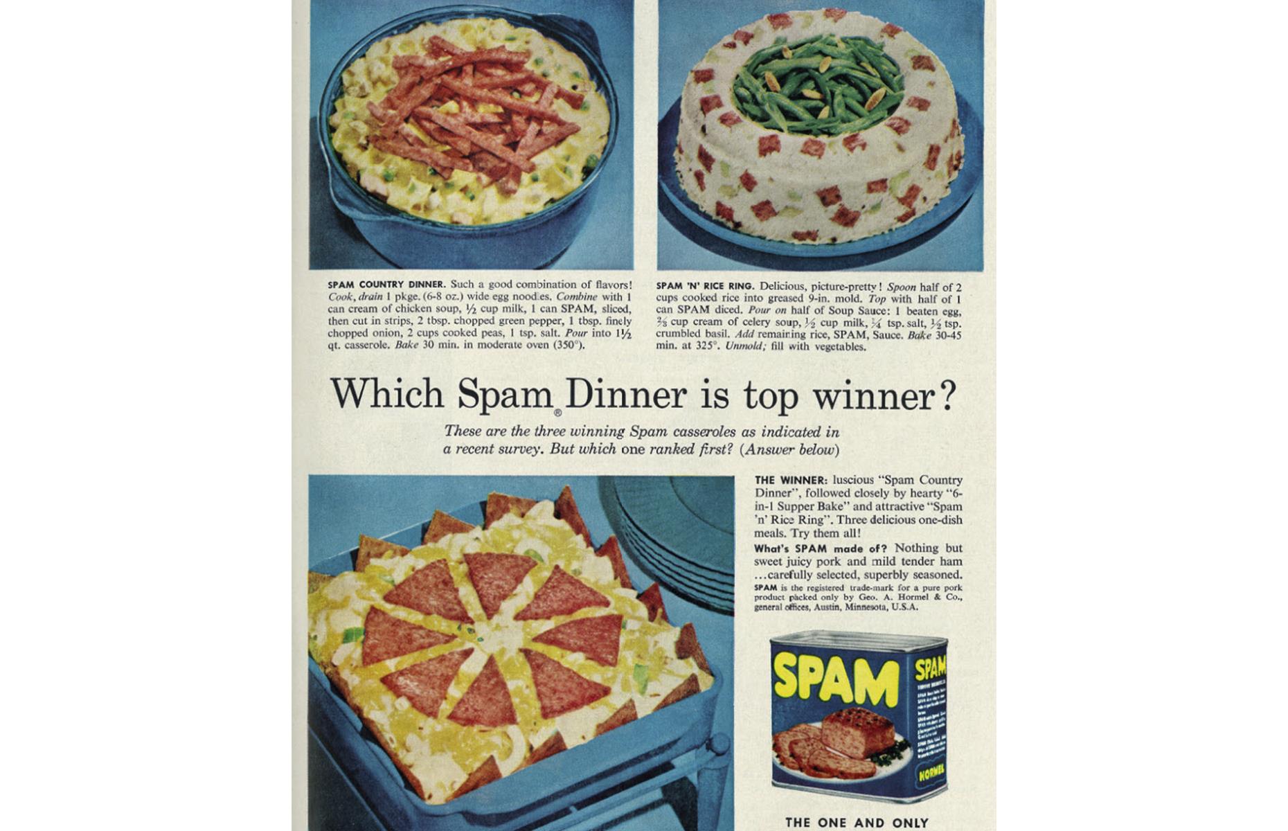 Kembali pada tahun 1958, perusahaan produsen makanan Hormel Foods mengajukan pertanyaan besar: “Paket makan malam SPAM mana yang menjadi pemenang teratas?” Secara mengejutkan, SPAM Country Dinner (spaghetti telur, sup ayam, SPAM, dan sayuran) menduduki posisi teratas, diikuti oleh 6-in-1 Supper Bake (kue makan malam SPAM, makaroni, sup jamur, dan kue panggang sayuran) serta SPAM ‘N’ Rice Ring (kue berbentuk bundt berisi nasi, SPAM, dan sup yang diisi dengan sayuran). Oh, betapa jauhnya kita telah berkembang dalam sekitar 60 tahun terakhir.