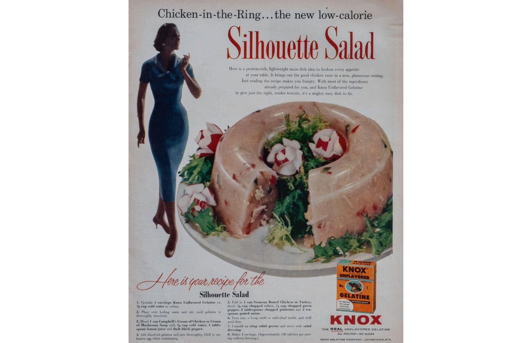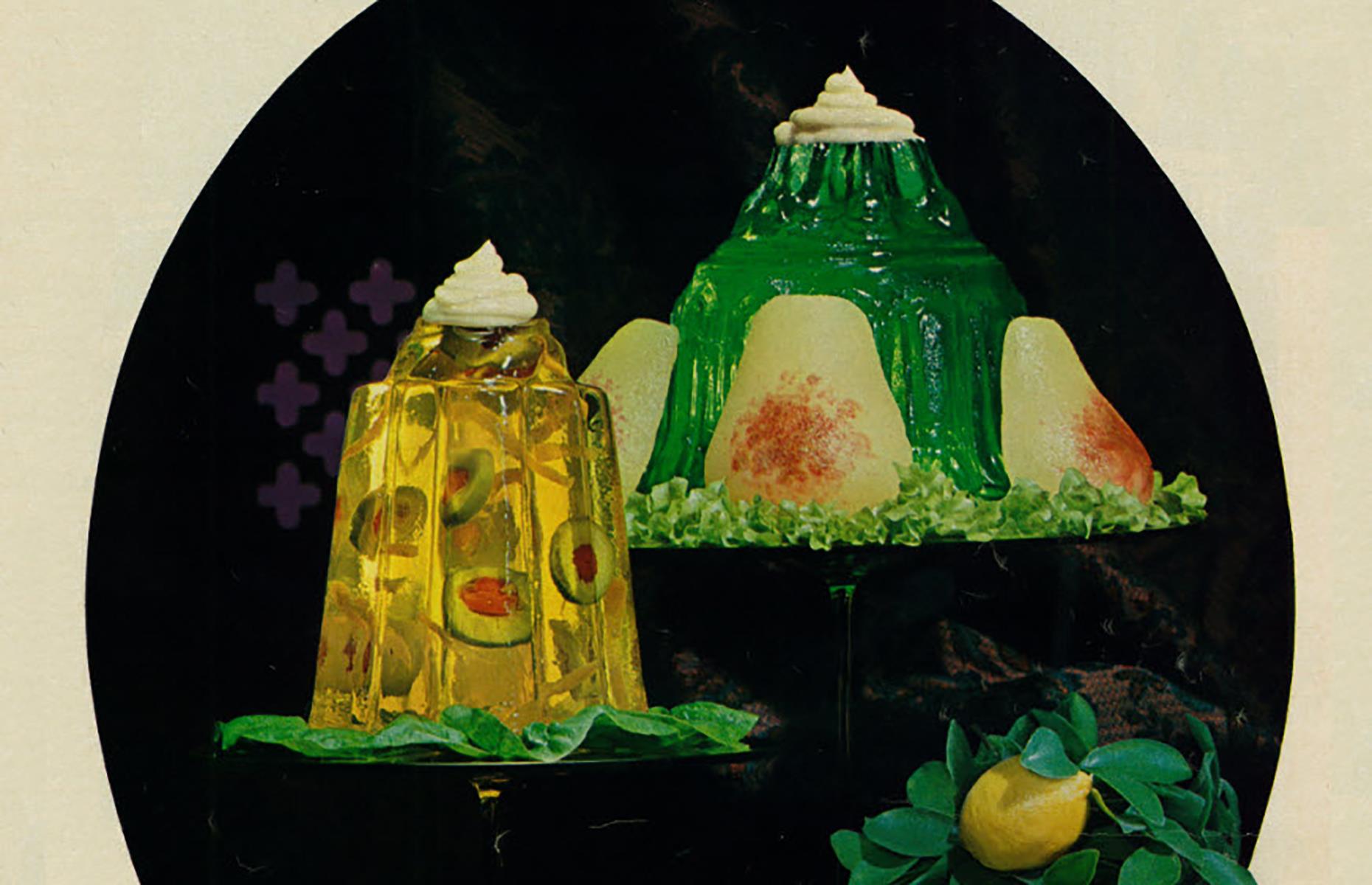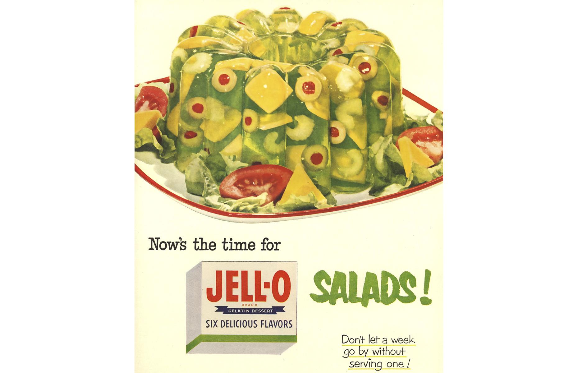 Beberapa cara, selama sebagian besar abad, Jell-O berhasil meyakinkan Amerika Serikat bahwa itu adalah bahan yang diperlukan dalam salad – namun secara ajaib, kita bertahan tanpa itu sekarang. Jell-O tersedia dalam enam rasa, tetapi salah satu yang populer adalah jeruk limau, ditampilkan dalam iklan lama ini yang menampilkan potongan olive, timun, dan keju. Nasihatnya adalah jangan biarkan seminggu berlalu tanpa menyajikan salad Jell-O; agak mengejutkan, para pengguna rumah tangga yang antusias dengan senang hati mematuhi.