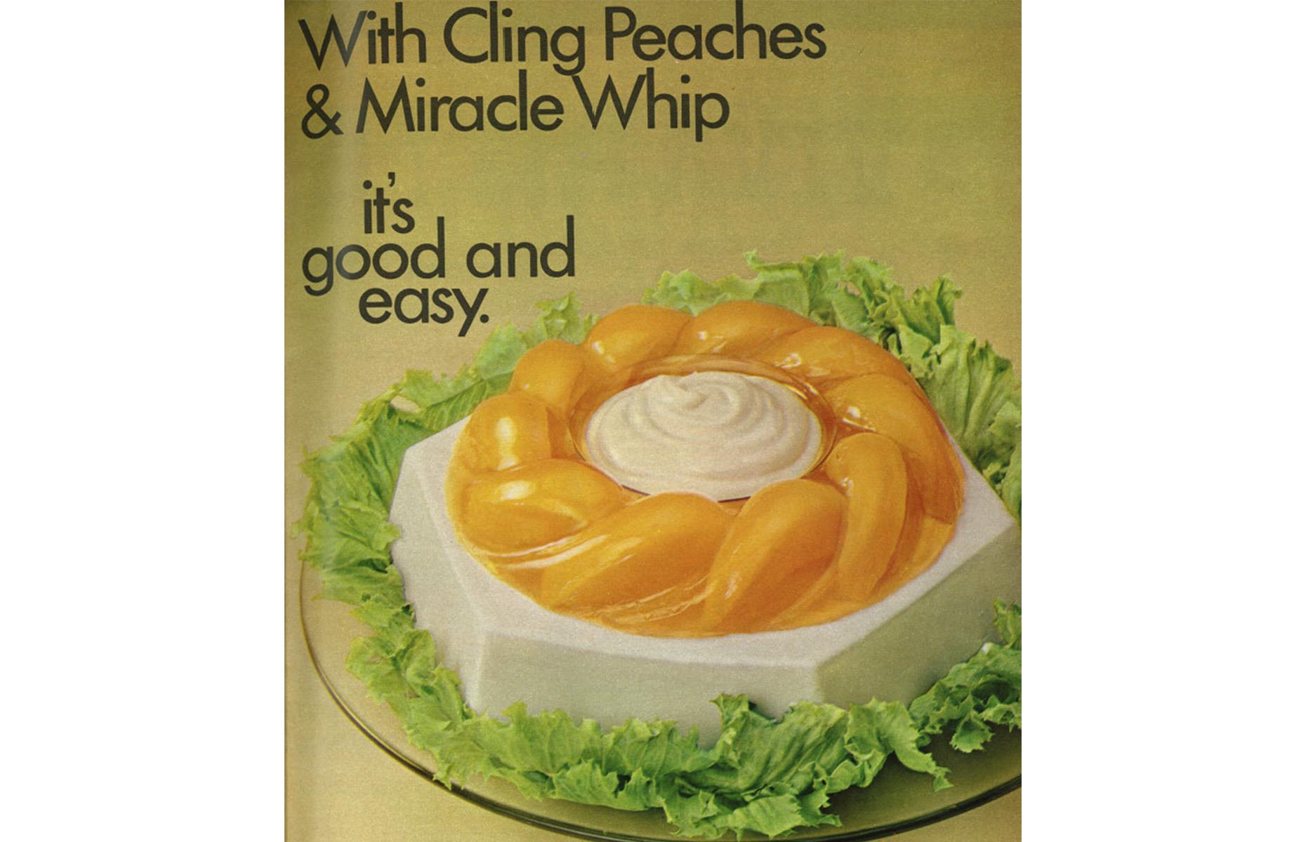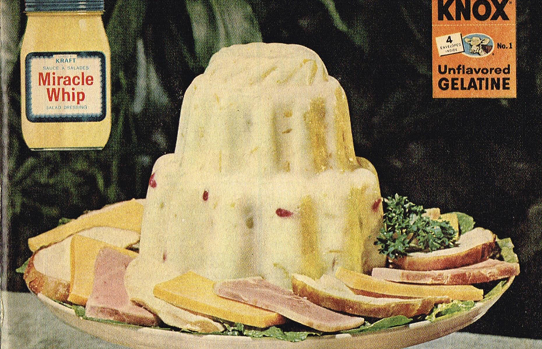 Piring Teras ini dari Miracle Whip dan Knox, yang diterbitkan dalamReader’s Digestpada tahun 1965, disajikan sebagai hidangan utama yang sempurna. Cocktail buah dan jelly mayones dikatakan cocok secara sempurna dengan potongan ham, ayam atau kalkun dingin serta irisan keju Kraft. Ia juga mengandung bahan rahasia yang sangat aneh: minuman jeruk beku.