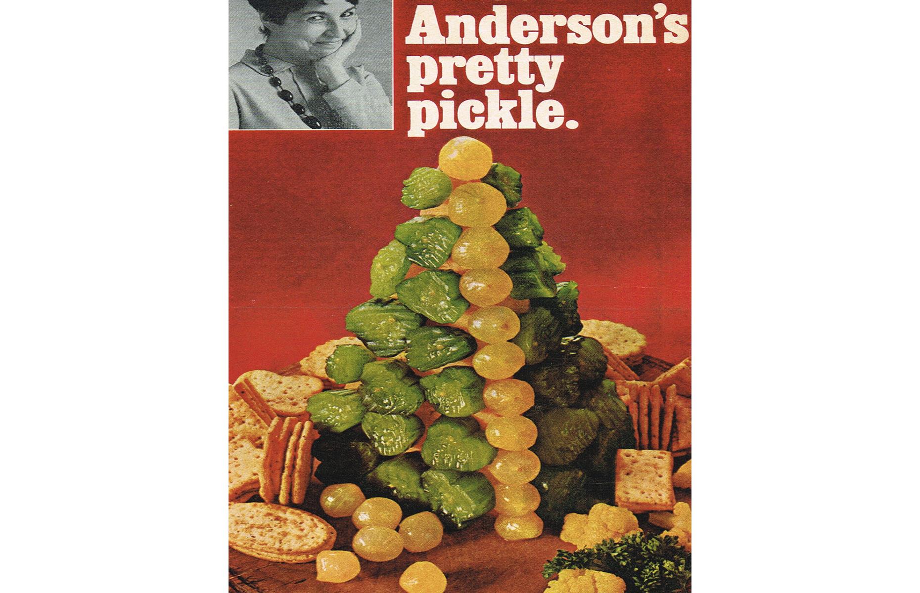 Jika Anda mencari dekorasi meja yang fungsionaldanpengisi, jangan mencari lebih jauh. Resep Alice Anderson untuk pohon acar yang cantik telah diterbitkan diPemilik istanamajalah pada Desember 1967. Jika Anda penasaran bagaimana membuatnya – dan bahkan jika Anda tidak – ini adalah potongan keju yang dipotong bagian bawahnya sehingga berdiri tegak, dan dihiasi dengan irisan acar Heinz dan bawang bombai asam pada tusuk gigi.