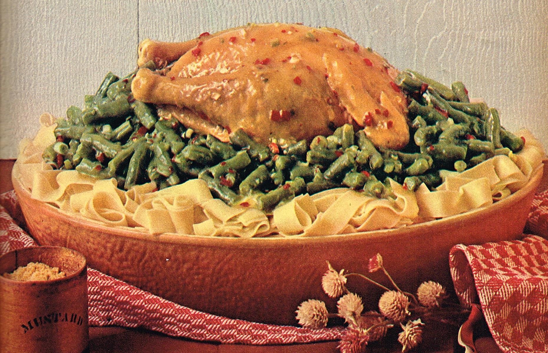 Perjamuan khas desa, Green Beans Gretel diterbitkan sebagai resep dalamLingkaran Keluargapada tahun 1963. Buncis hijau Del Monte dimasak dengan mentega, bawang, cabai, lada hitam, dan mustard, lalu disajikan dengan ayam dan pasta. Sampai di sini, semuanya baik-baik saja. Tapi penyajiannya dengan seluruh ayam panggang di atasnya? Sedikit kasar – dan mungkin juga membuat proses memotong dan menyajikannya menjadi sulit.