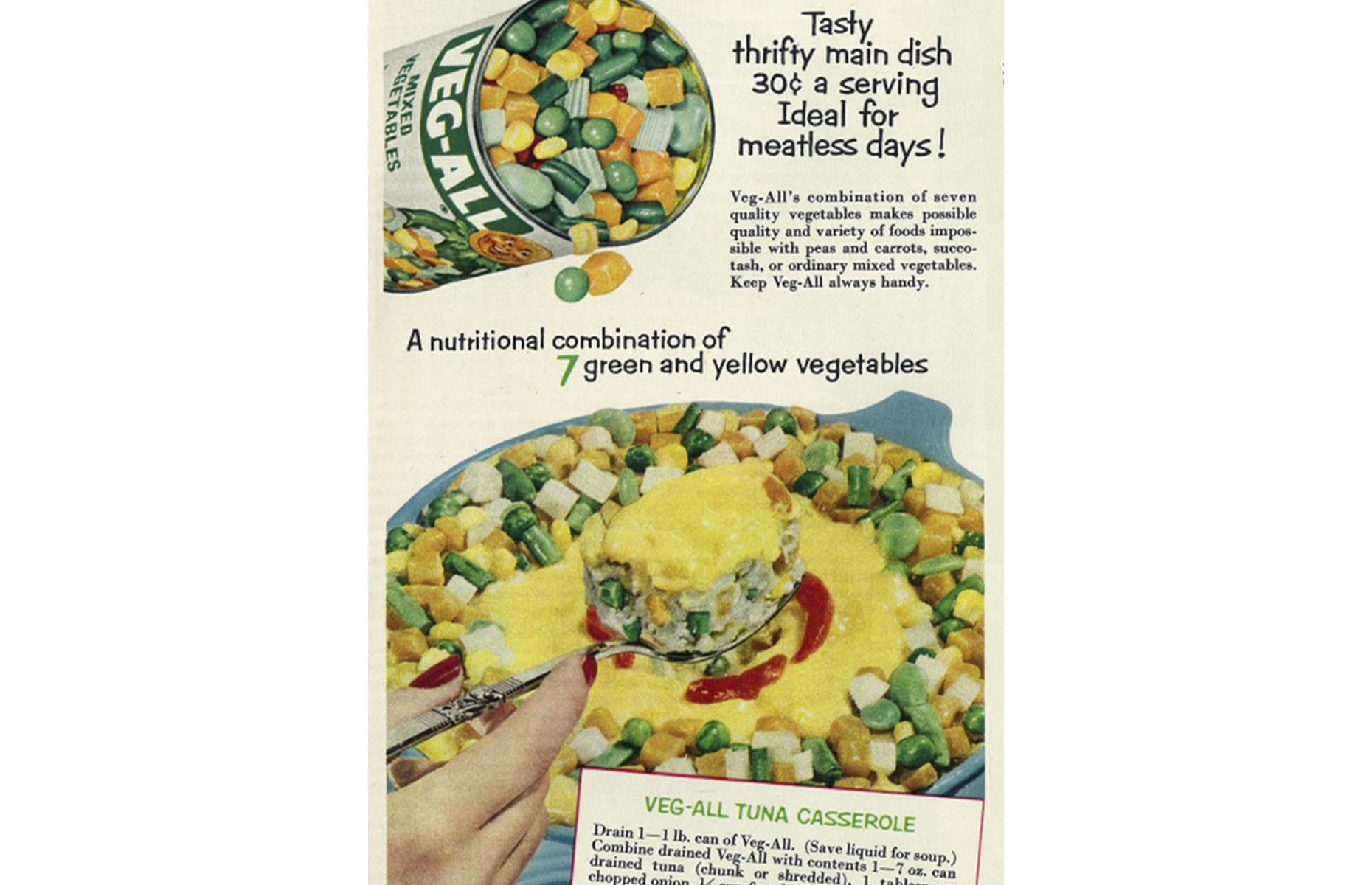 Tuna noodle casserole menjadi sangat populer pada tahun 1950-an, karena merupakan cara yang murah dan mudah untuk memberi makan keluarga. Namun, Veg-All Tuna Casserole ini, yang dibuat dengan sayuran kaleng campuran, tuna, bawang bombai cincang, saus Worcestershire, roti panggang dan keju, membawa hal tersebut terlalu jauh. Diterbitkan sebagai ide resep pada tahun 1953 oleh merek makanan klasik Veg-All, resep ini tidak mengandung pasta sama sekali – dan memiliki saus tomat yang disemprotkan di atasnya.