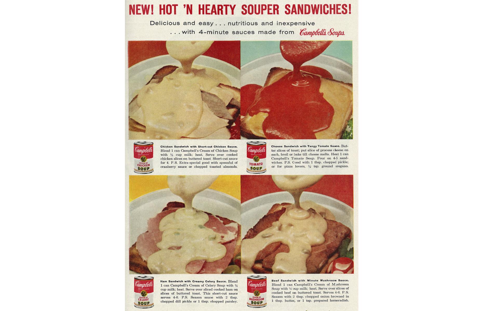 Pada tahun 1950-an, Campbell’s mencoba meyakinkan kita bahwa sandwich bisa dibuat hangat dan bergizi dengan mengganti potongan roti bagian atas dengan saus yang terbuat dari kaleng sup. Ia menyarankan sup ayam untuk sandwich ayam, sup tomat asam untuk sandwich keju, sup seledri kaya untuk sandwich ham, dan sup jamur untuk sandwich daging sapi. Iklan itu sebenarnya tidak benar-benar menjualnya kepada kita…