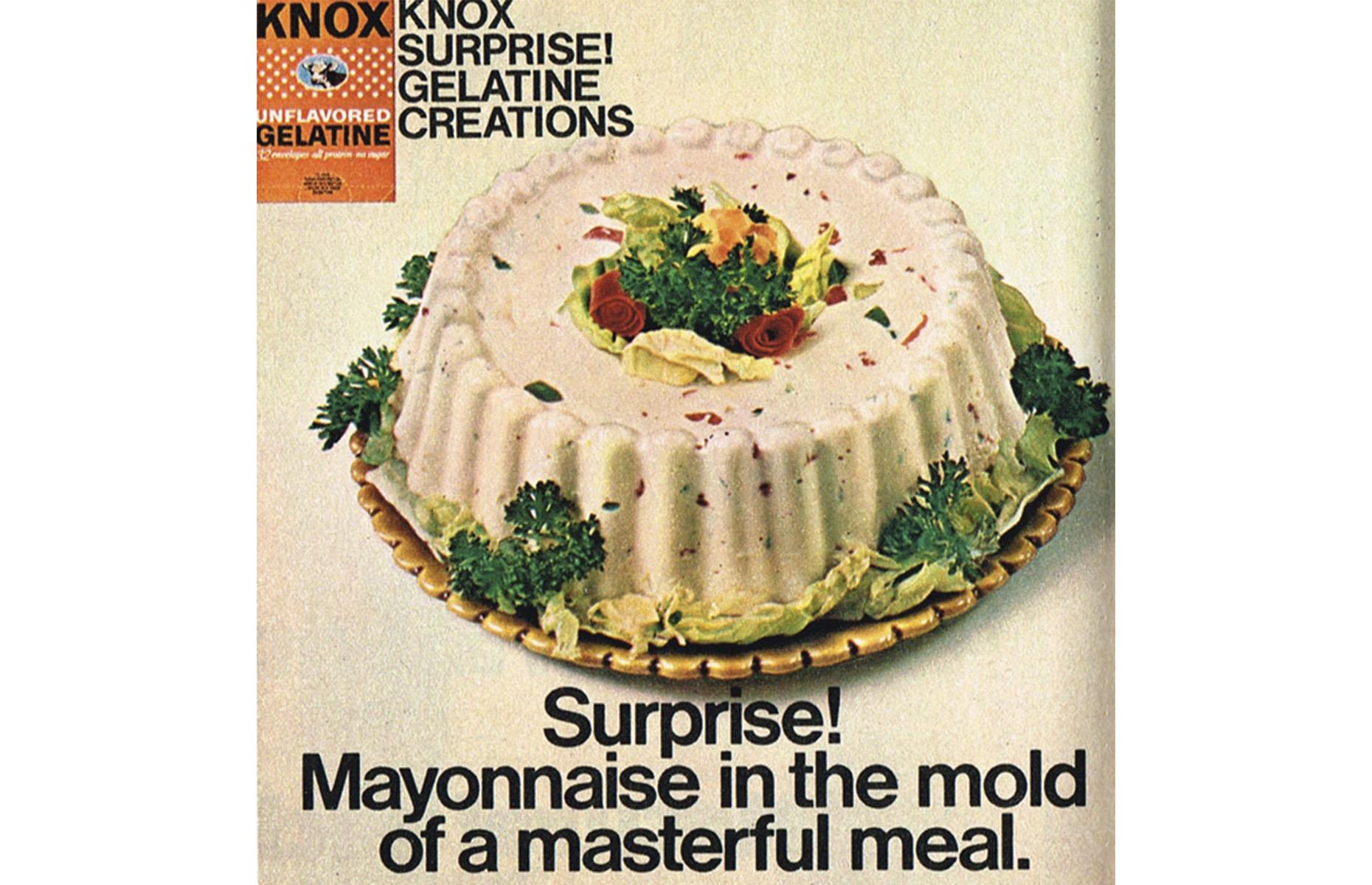 Kaget! Bentuk saus mayones ini dari tahun 1970-an adalah puncak kehebatan dalam menyambut tamu pada masanya. Tampak seperti hasil kerja berjam-jam di dapur, sebenarnya berasal dari kotak resep yang menunjukkan secara tepat bahan-bahan yang harus digunakan. Makanan yang luar biasa, atau pemasaran yang luar biasa dari Knox? Anda putuskan.