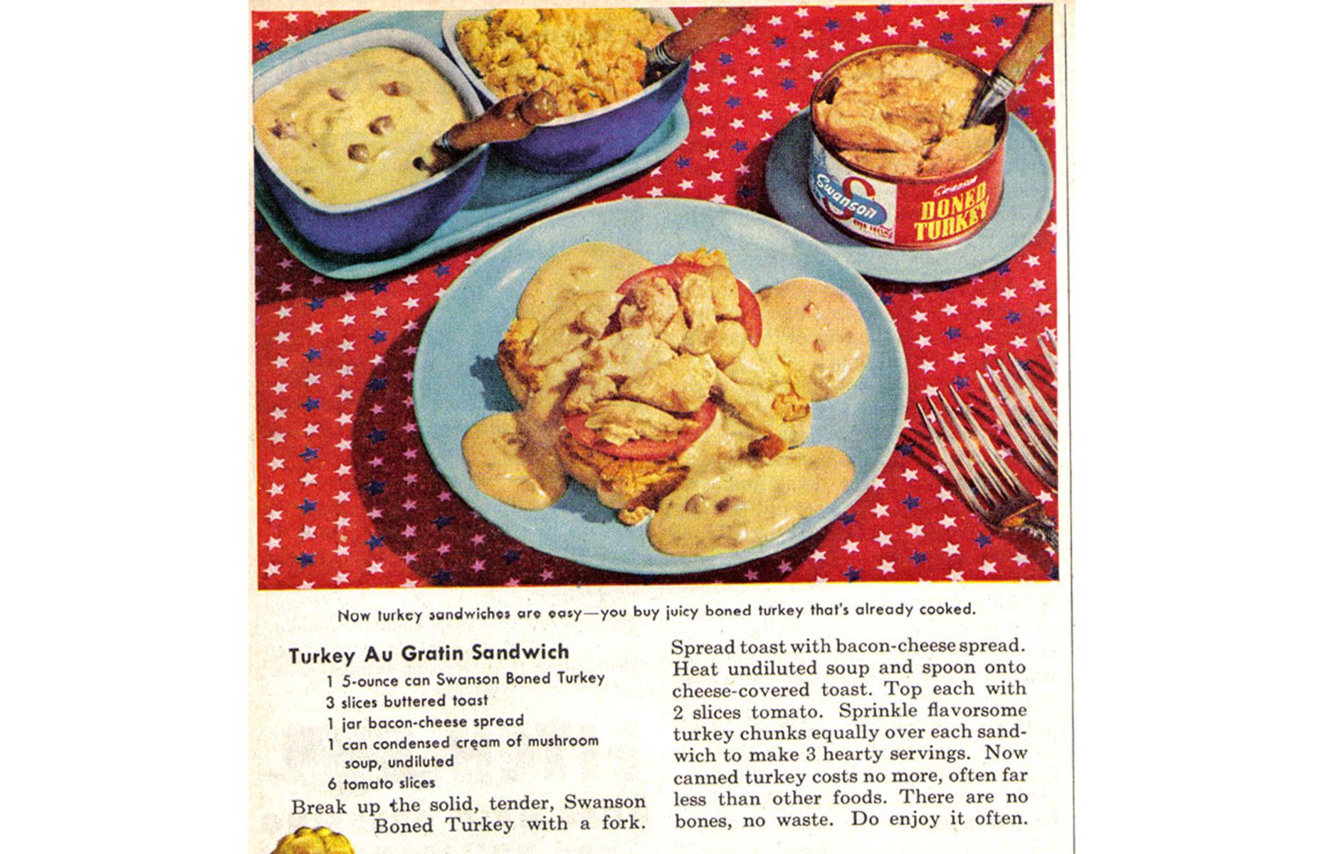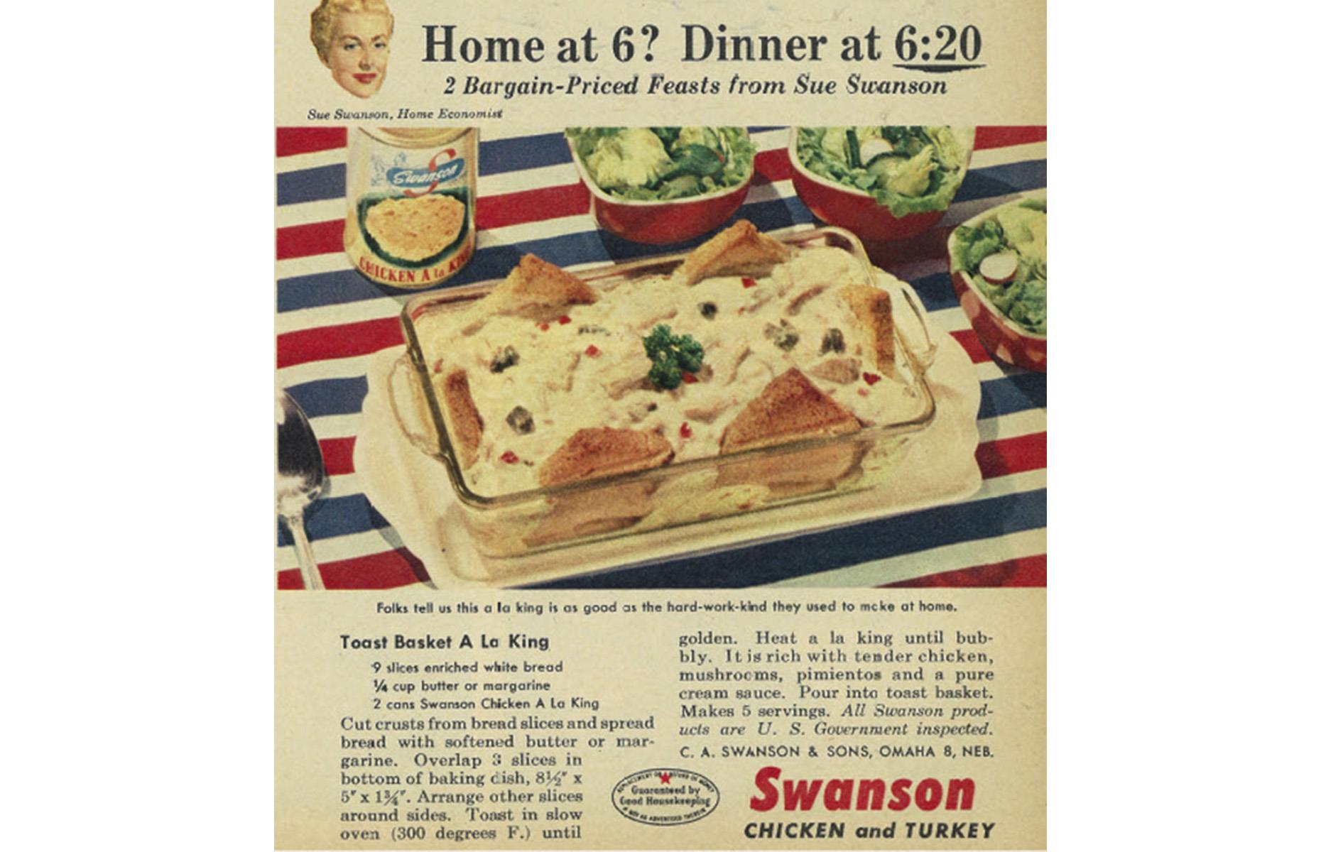 Hidangan ayam yang kaya ini populer sepanjang abad ke-20 – dan resep Swanson untuk itu, yang diterbitkan dalamLingkaran Keluargapada tahun 1953, bahkan menerimaGood Housekeepingsurat keterangan persetujuan. Roti putih diolesi mentega, dipanggang di oven, lalu ditaburi kaleng ayam Swanson à la King. Kami tidak yakin sebuah resep yang menjelaskan cara menuang makanan kalengan ke atas roti panggang benar-benar diperlukan.