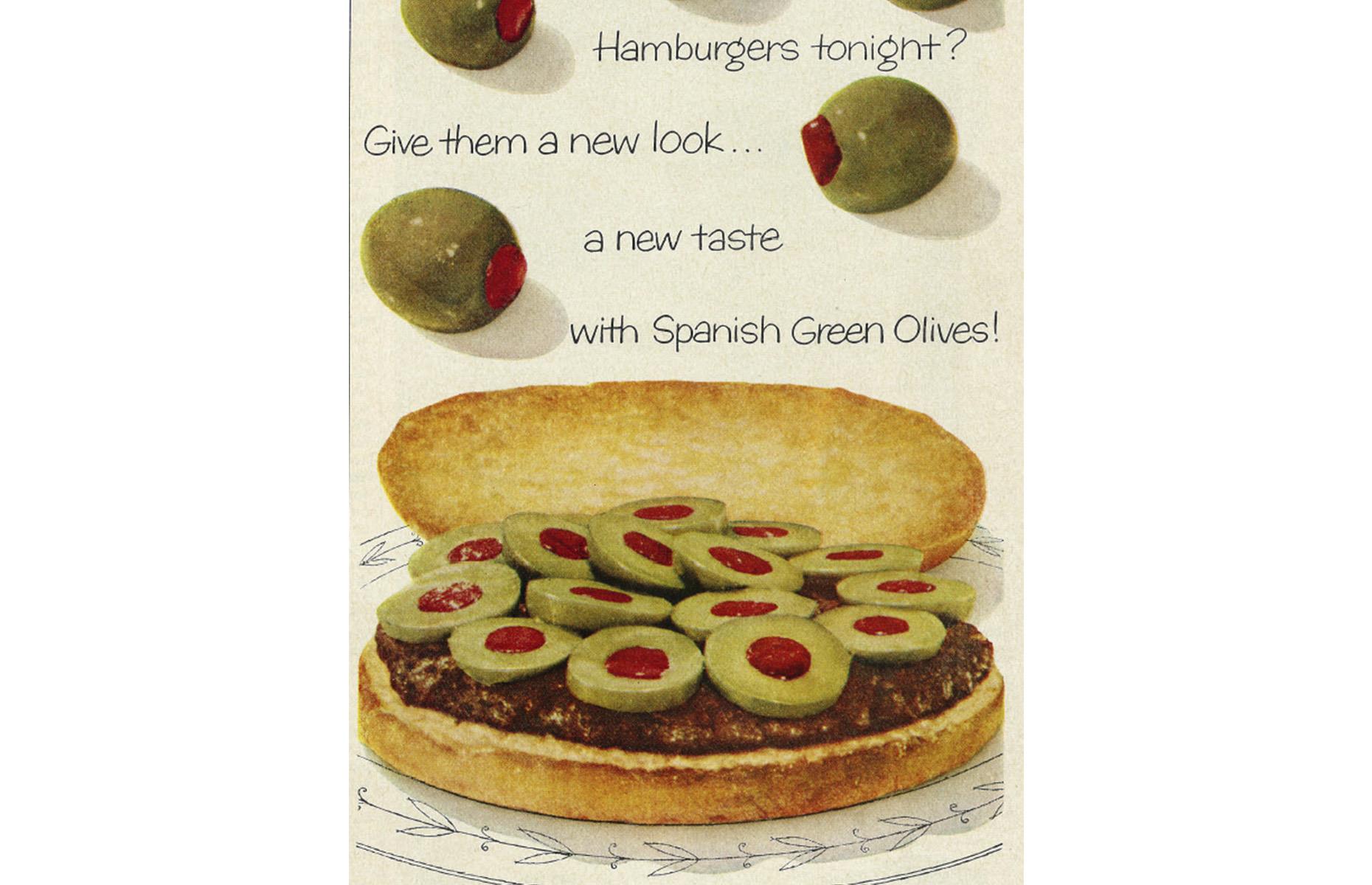 Arisan olive hijau Spanyol yang diimpor adalah puncak kesophistikan kuliner pada masa lalu. Camilan asin ini disajikan sebagai pelengkap berbagai hidangan; orang-orang meletakkannya di atas log keju, sosis frankfurt, burger, dan banyak lagi. Namun demikian, kami tidak bisa tidak berpikir bahwa resep hamburger ini, yang diterbitkan dalamGood Housekeepingpada tahun 1958, akan lebih baik tanpa mereka.