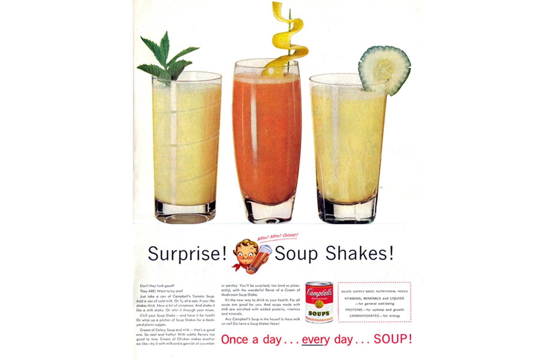 Sup yang enak untuk menghangatkan tubuh di musim dingin, dan terkadang dirancang untuk disajikan dingin juga. Tapi pada tahun 1956, Campbell’s mengusulkan cara baru untuk menikmati sup dingin: dengan mengubahnya menjadi milkshake. Tomat, krim seledri, krim jamur, dan krim ayam adalah rasa yang ditawarkan untuk shake gurih ini, yang diklaim oleh Campbell’s sebagai sehat dan mudah dibuat.