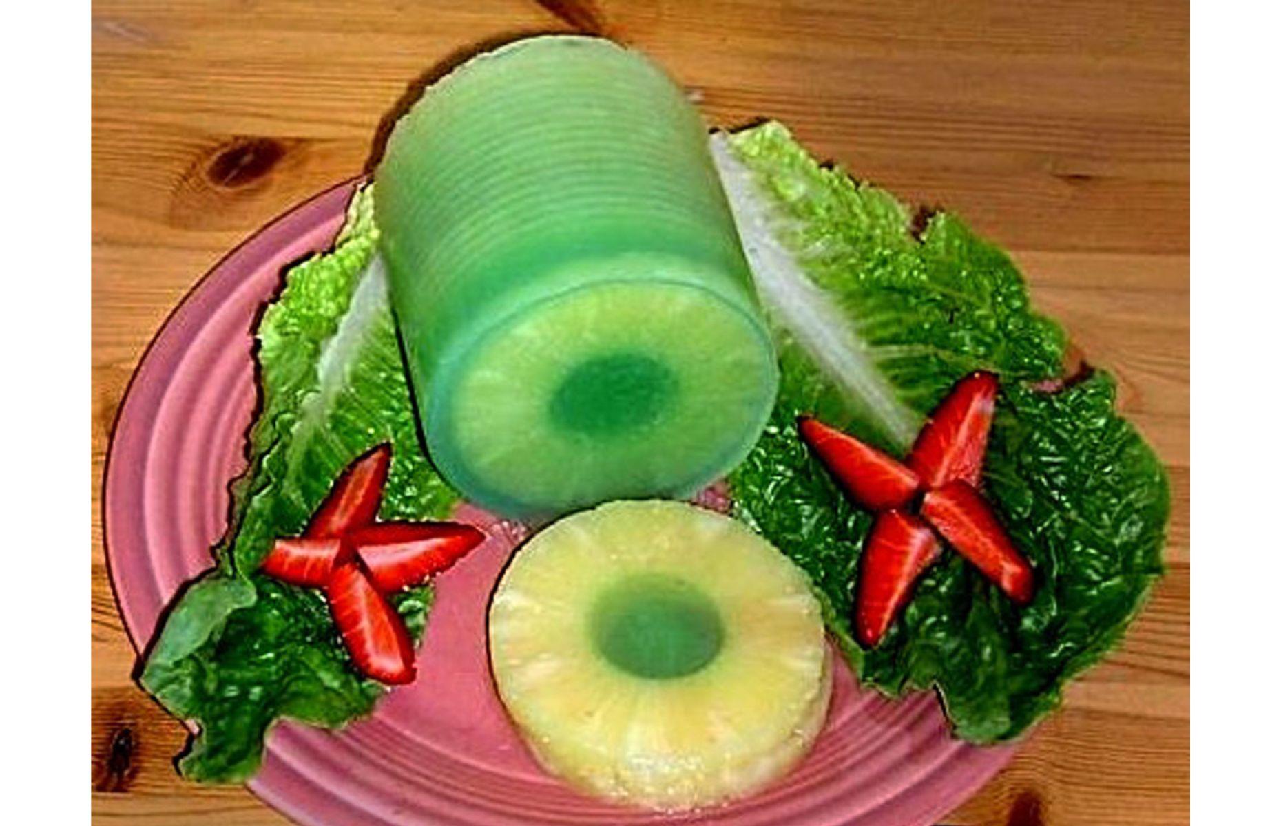 Puluhan tahun 1970an dipenuhi dengan kejahatan terhadap (dan dilakukan oleh) Jell-O, mulai dari sosis hingga ikan utuh yang dibungkus dengan bahan berwarna hijau yang menggoyang-goyangkan ini. Resep yang tampak menyeramkan ini adalah saran penyajian umum dari merek buah kaleng seperti Dole, dan satu-satunya hal yang dimilikinya adalah kesederhanaannya. Untuk membuatnya, Anda hanya perlu menguras air dari kaleng nanas, tambahkan Jell-O, lalu biarkan mengeras – bahkan di dalam kalengnya sendiri. Mungkin bukan hidangan yang paling rumit, tetapi, dibandingkan dengan beberapa makanan buruk pada masa itu, rasanya mungkin tidak terlalu buruk.