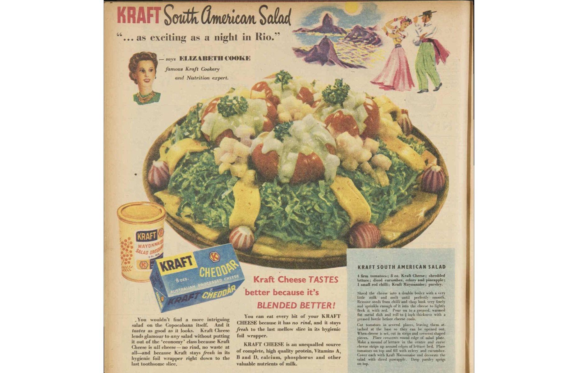 Berikut adalah resep ‘eksotis’ lainnya yang terdengar (dan terlihat) sama sekali tidak. Faktanya, bahan-bahan satu-satunya yang memberikan kejutan pada salad dasar ini yang terdiri dari keju Kraft, tomat, selada dan mentimun hanyalah nanas dan cabai merah cincang — bukan sesuatu yang “sehebat malam di Rio”, seperti yang dijanjikan oleh tagline-nya. Lagipula, iklan ini diambil dari edisi…Mingguan Wanita Australiadari tahun 1949.