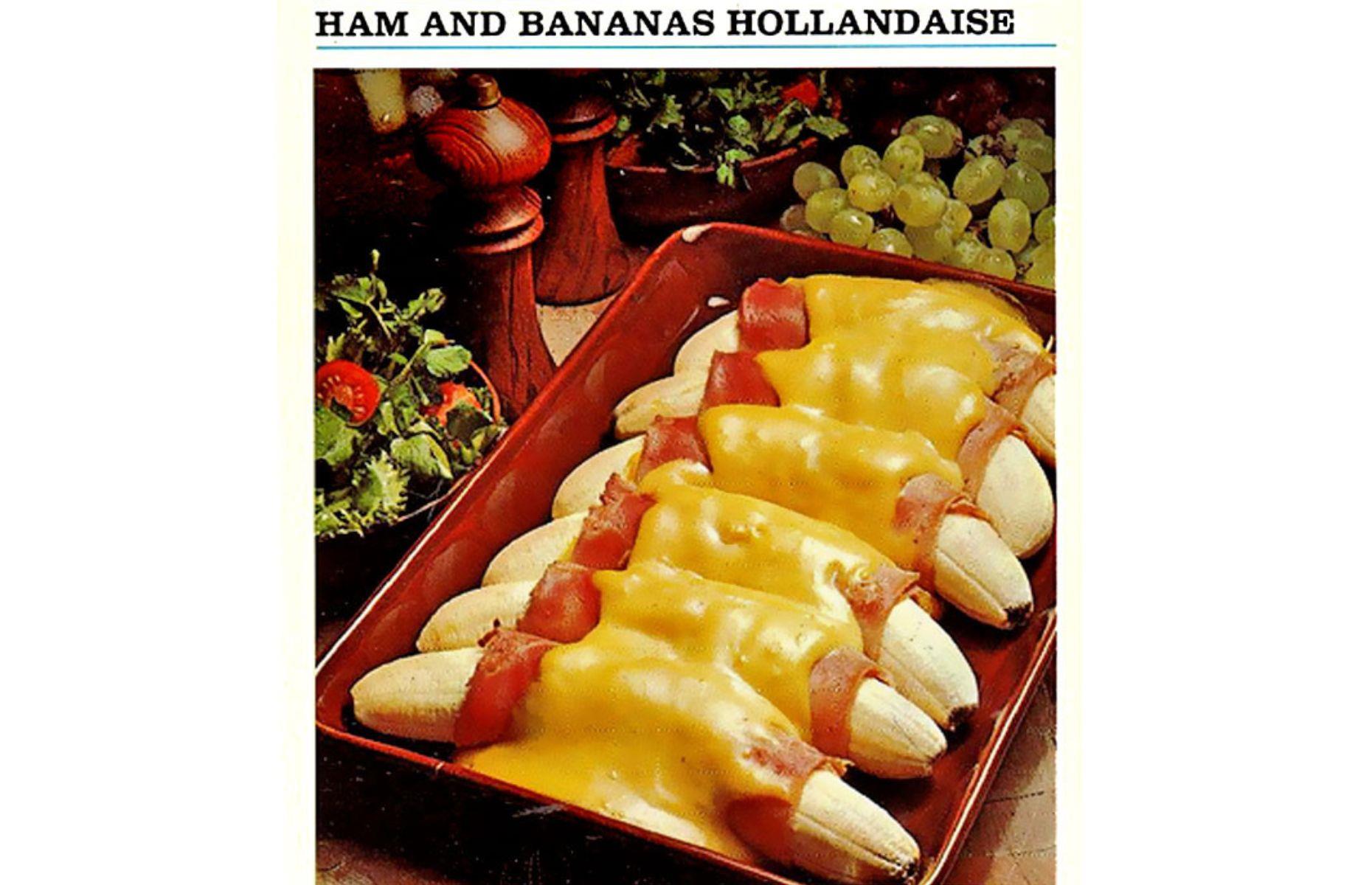 Ciptaan mengerikan ini pasti akan menjadi topik pembicaraan di sarapan pagi. Diambil dari McCall’sKumpulan Kartu Resep Masakan Amerika yang Hebatsejak 1973, penggoda aneh ini tentang telur Benedict menampilkan pisang yang dibungkus dengan ham, ditaburi saus Hollandaise yang kaya mentega, dan dipanggang dalam wadah casserole hingga berwarna keemasan. Bagaimana Anda menyajikan kreasi seperti ini? Menurut resepnya, ini “cocok dengan salad hijau untuk sarapan atau makan siang”. Kami tidak yakin sepenuhnya…