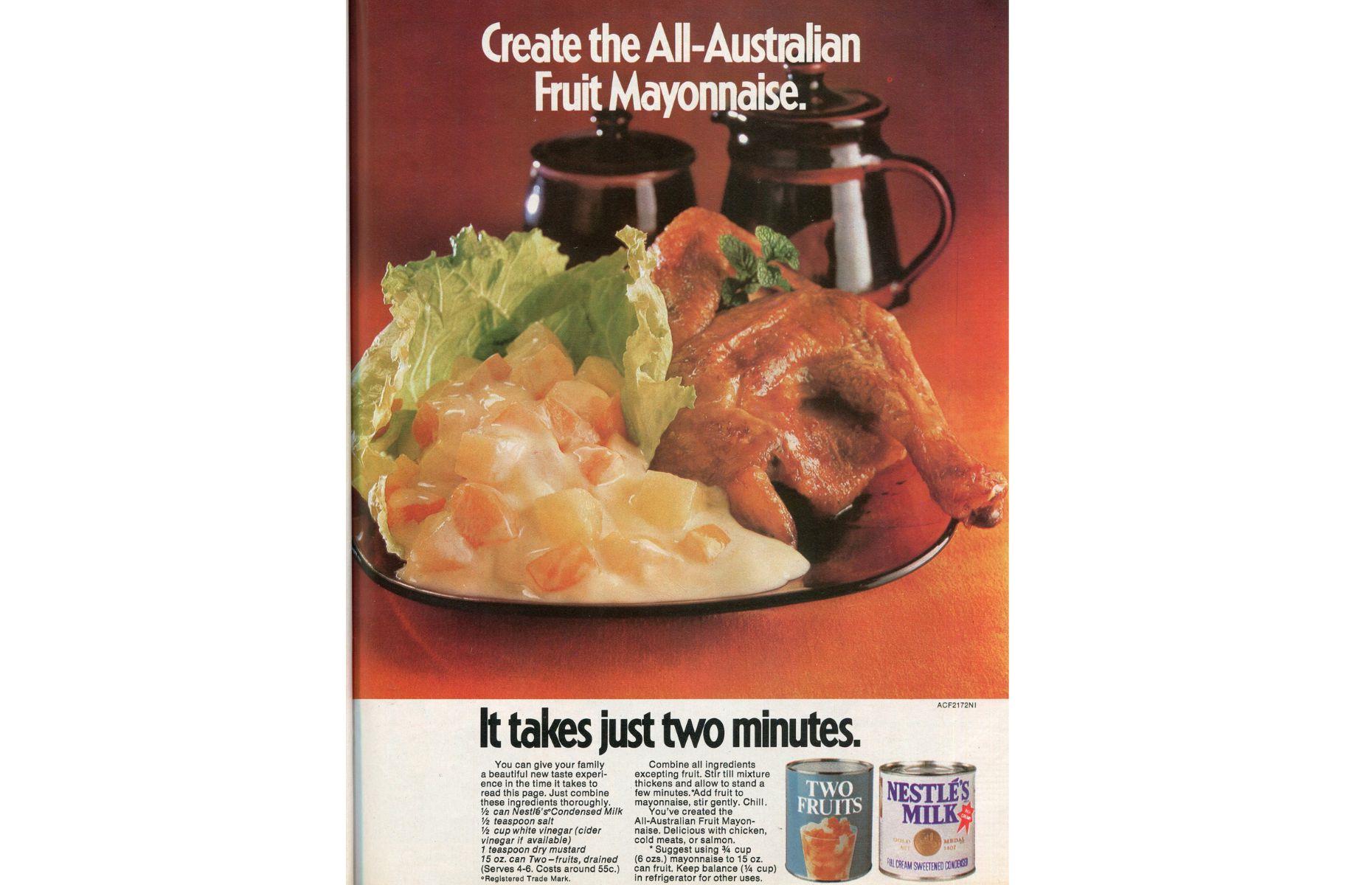 Mayones adalah bahan utama dalam banyak eksperimen kuliner dari tahun 1970-an – dan pengunjung restoran Australia tentu saja tidak terhindar dari pengalaman makan hidangan seperti ini dari edisi tahun 1973 majalah wanitaIde BaruMenggabungkan Susu Kental Nestlé dan buah kalengan untuk membuat ‘Mayonnaise Buah Asli Australia’, hasilnya seharusnya disajikan dengan ayam panggang, daging dingin atau salmon. Penyajian yang aneh, dengan salad mayonnaise yang tumpah di atas piring bersama apa yang tampak seperti ayam panggang yang terlalu mengkilap, tidak membantu situasi.