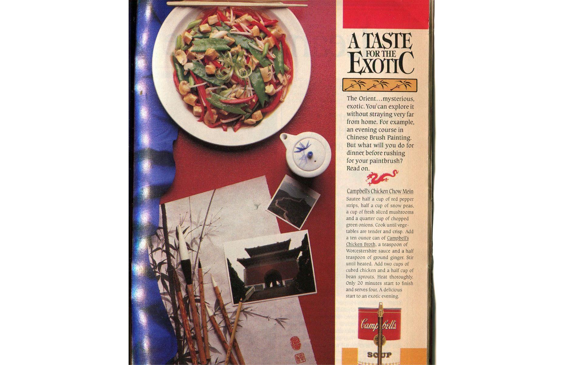 Iklan ini untuk versi yang terdengar membosankan dari chicken chow mein menjanjikan ‘rasa eksotis’, tetapi kami tidak melihat bagaimana menambahkan seluruh kaleng Campbell’s Chicken Soup ke dalam masakan tumis dapat menghasilkan apa pun selain mangkuk mi yang lembek. Resep ini ditampilkan dalam edisi tahun 1984 dari Toronto’sPanduan TV– iklan bahkan menyarankan untuk memakannya sebelum pergi mengikuti kursus seni lukis cat Tiongkok di malam hari – dan menyoroti ledakan popularitas masakan Tiongkok-Kanada pada tahun 1980-an.