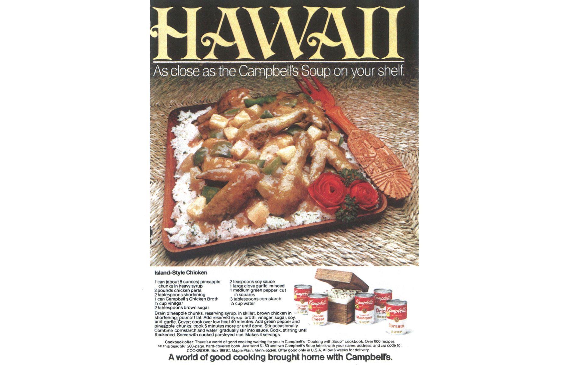 Resep ini dari tahun 1978 mengklaim dapat membuat Hawaii terasa ‘sedekat kaleng sup Campbell yang ada di rak Anda’. Namun, melihat penampilannya dan daftar bahan (menggabungkan kaleng sup kaldu ayam Campbell dengan potongan nanas, ayam, bawang putih, dan paprika hijau), kami tidak yakin. Fakta bahwa resep ini hanya meminta ‘bagian ayam’ alih-alih menyebutkan potongan tertentu juga sedikit mencurigakan.