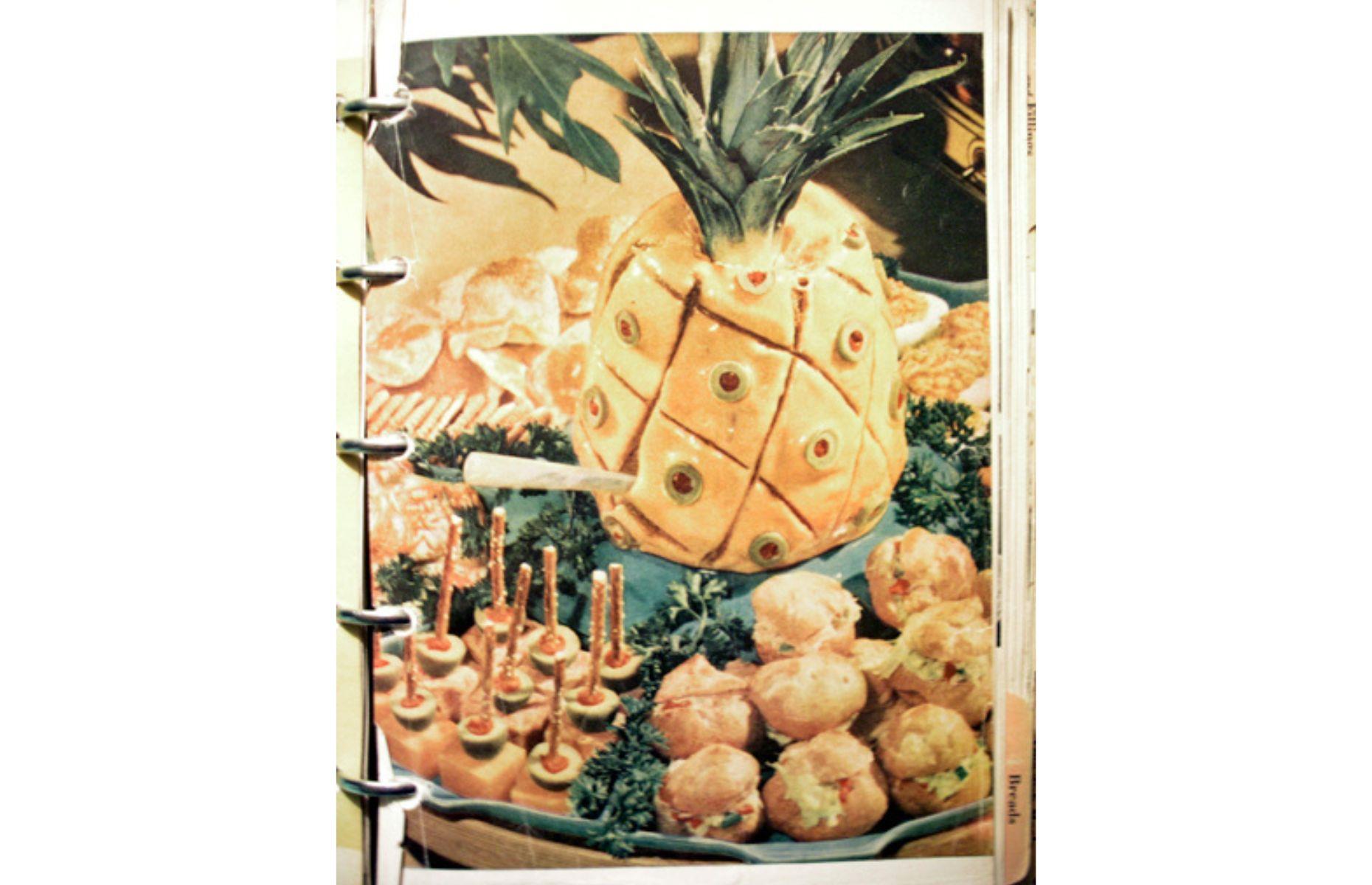 Mungkin salah satu resep paling memprihatinkan yang pernah kami temui (baik dari penampilannya maupun dari daftar bahan-bahannya), pusat hidangan nanas raksasa ini sama sekali tidak terbuat dari buah. Sebaliknya, hidangan ini dibuat dengan mencampur sosis hati dengan saus Worcestershire, mayones, dan air perasan jeruk lemon, membungkus seluruh campuran itu di sekitar botol selai, lalu menambahkan lapisan krim berbahan gelatin dan mayones agar menyerupai penampilan buah tropis. Resep ini dipublikasikan pada tahun 1953Resep Masakan Better Homes and Gardens, dan kami senang itu tidak muncul kembali sejak itu.