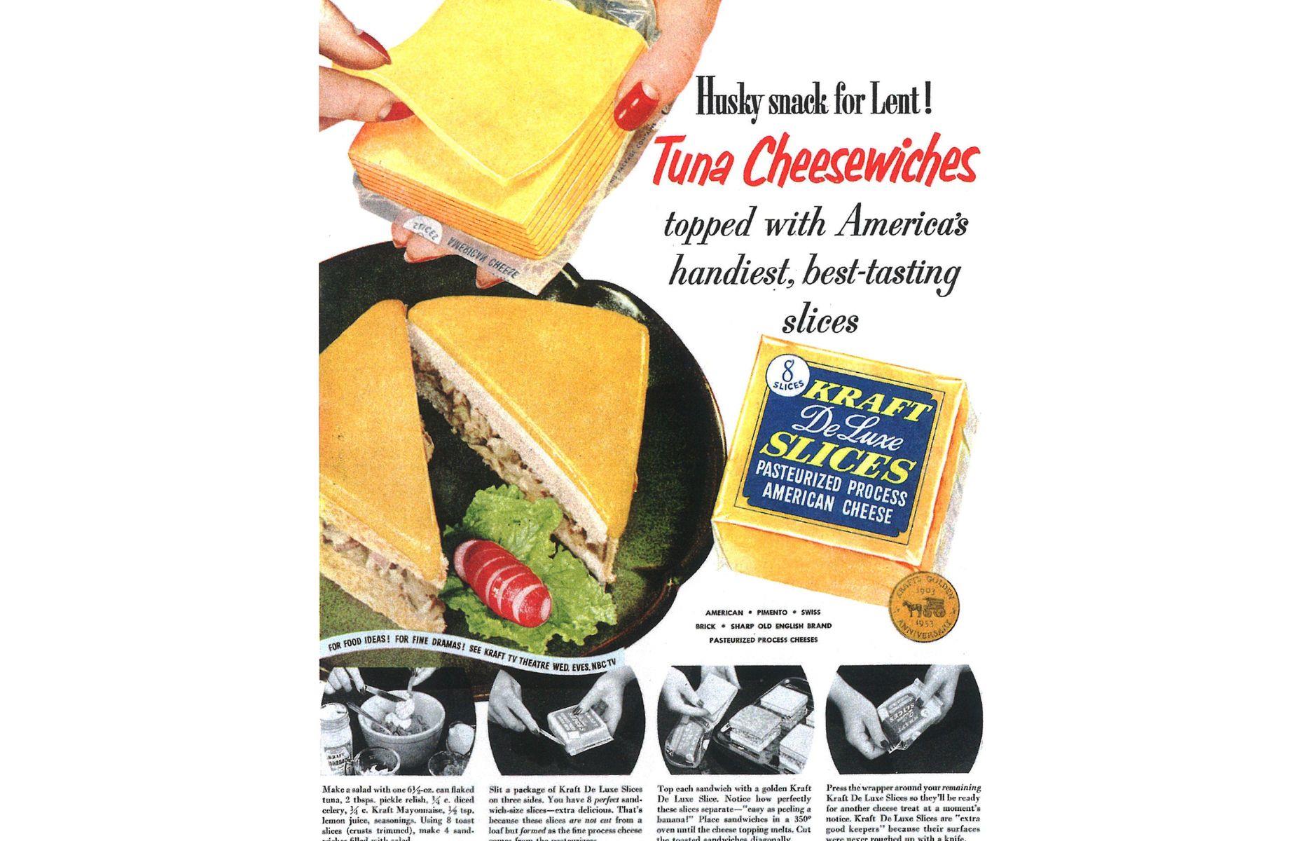 Perusahaan makanan Amerika Kraft dikenal dengan resep-resep anehnya – dan kreasi tahun 1953 ini tidak berbeda, memberikan pendekatan baru pada tuna melt klasik. Salad tuna yang kaya mayones ditumpuk di antara dua irisan roti panggang, dibungkus dengan keju Kraft De Luxe, lalu dipanggang hingga keju Amerika menjadi leleh dan meleleh. Meskipun terdengar cukup menarik, kami merasa sedikit cemas saat membayangkan menggenggamnya tanpa membuatnya berantakan (atau bahkan terluka oleh keju yang menetes).