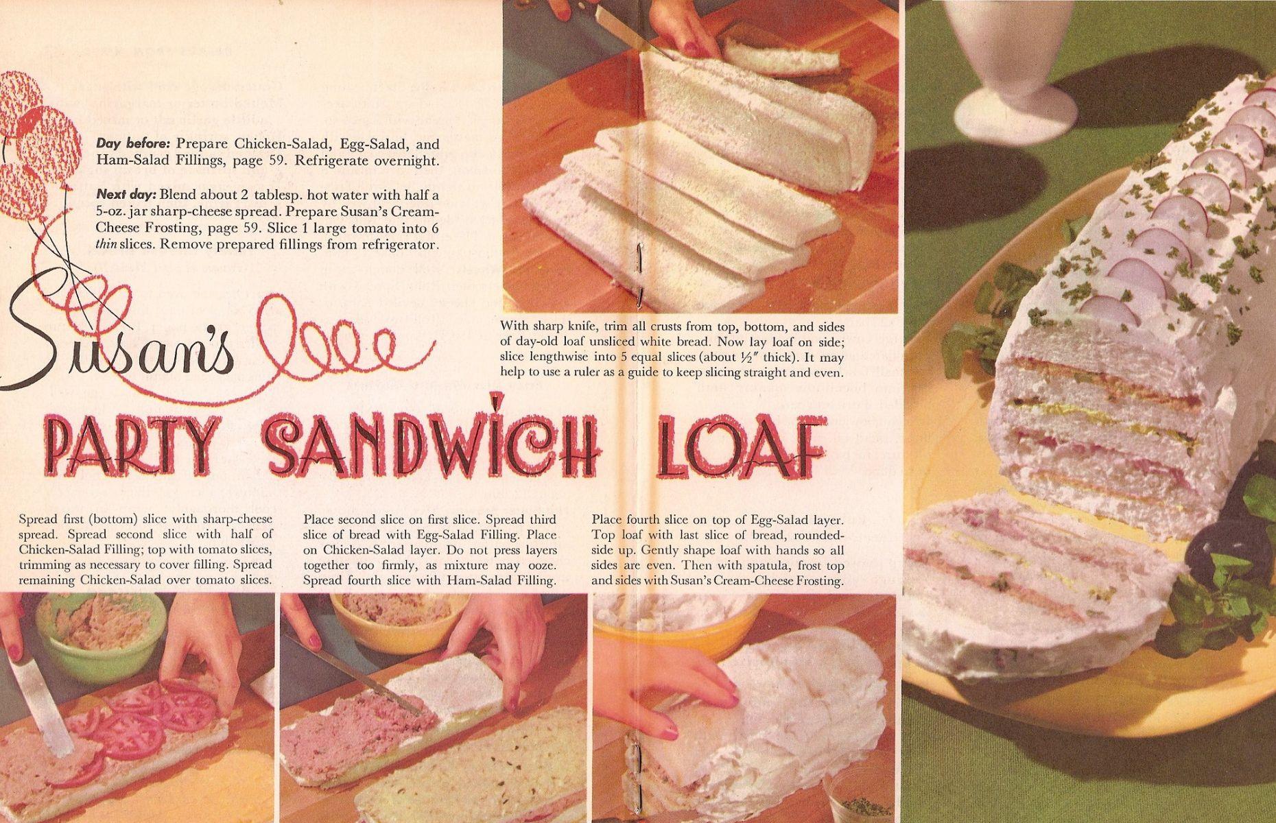 Menyelenggarakan pesta ulang tahun? Kami sangat memahami jika Anda menghindari Susan’s Party Sandwich Loaf. Diterbitkan dalamBuku Roti dan Sandwich Good Housekeepingpada tahun 1958, resep ini menampilkan roti panggang yang dipotong secara horizontal menjadi irisan besar, lalu diisi dengan lapisan salad ayam, salad telur, dan salad ham. Dihiasi dengan lapisan krim keju, ini dirancang untuk dipotong seperti potongan kue. Meskipun isiannya mungkin sangat lezat secara terpisah, kami tidak yakin apakah kami bisa setuju dengan penampilan mirip kue ulang tahun atau campuran rasa yang ada.