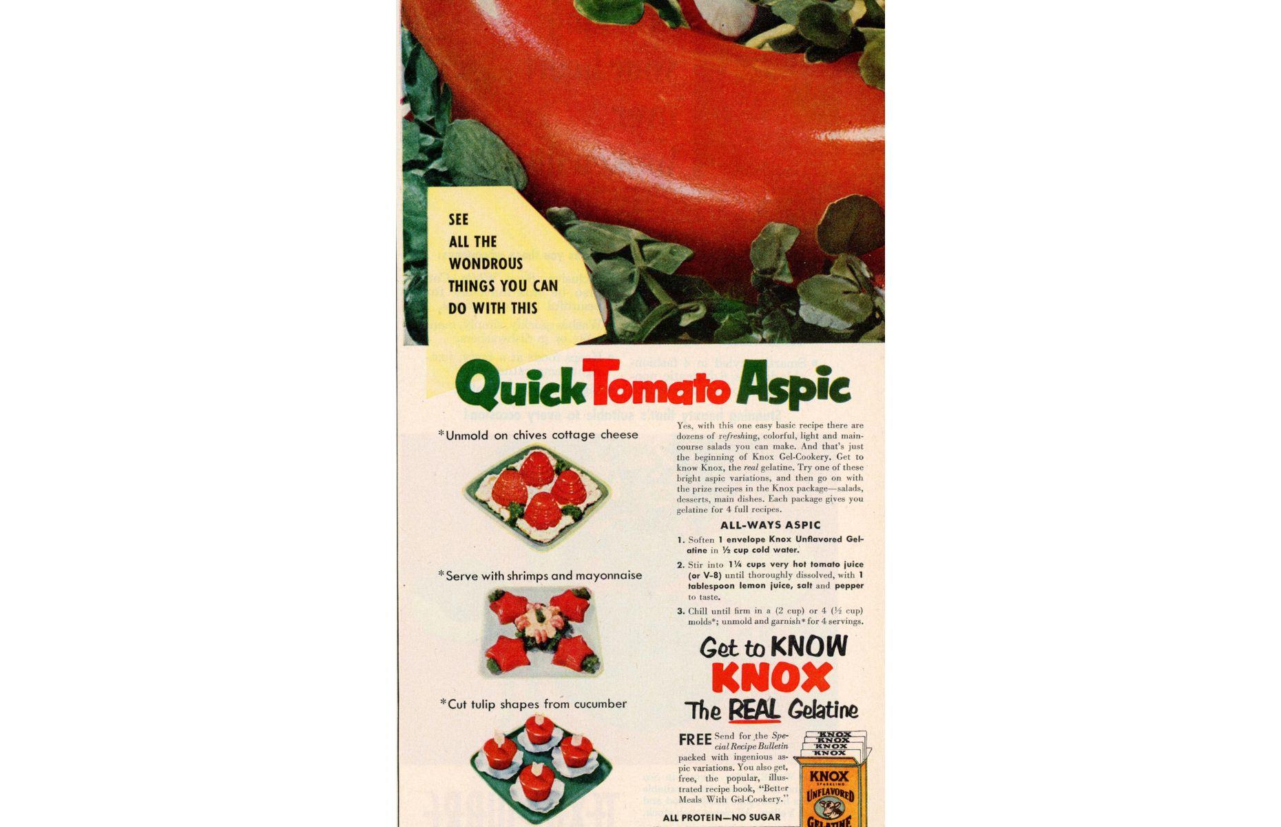 IniGood Housekeepingresipi dari tahun 1953 menyarankan menggabungkan jus tomat dengan jus lemon, garam, lada, dan Knox gelatine untuk membuat berbagai macam ‘salad yang segar, berwarna-warni, ringan, dan utama’. Pelengkap yang disarankan untuk campuran seperti jelly ini termasuk udang dan mayones, keju cottage dan seledri, serta irisan mentimun yang dibentuk seperti bunga.