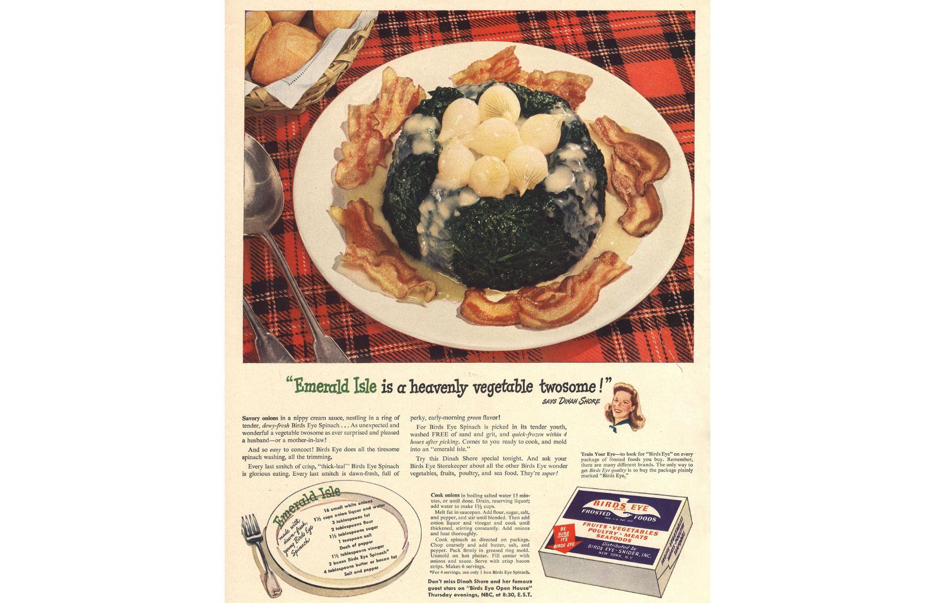 Bawang bombai bayi dan bayam yang airnya banyak dengan saus krim yang cair terdengar sangat tidak menarik, yang mungkin menjelaskan mengapa Birds Eye menyembunyikan hidangan tersebut sebagai ‘Emerald Isle’ dalam iklan tahun 1960-an ini. Hidangan ini disajikan dengan bacon renyah, tetapi hal itu pun tidak membantu penampilannya, karena hidangan tersebut terlihat – dan terdengar – bingung dan menakutkan. Ini pasti bukan sebuah “pasangan sayuran surgawi”, sebagaimana digambarkan.