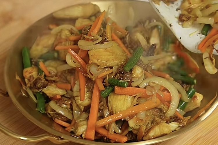 - Tumis bawang bombai, kacang panjang, wortel, dan sedikit air. Masak hingga sayur matang.