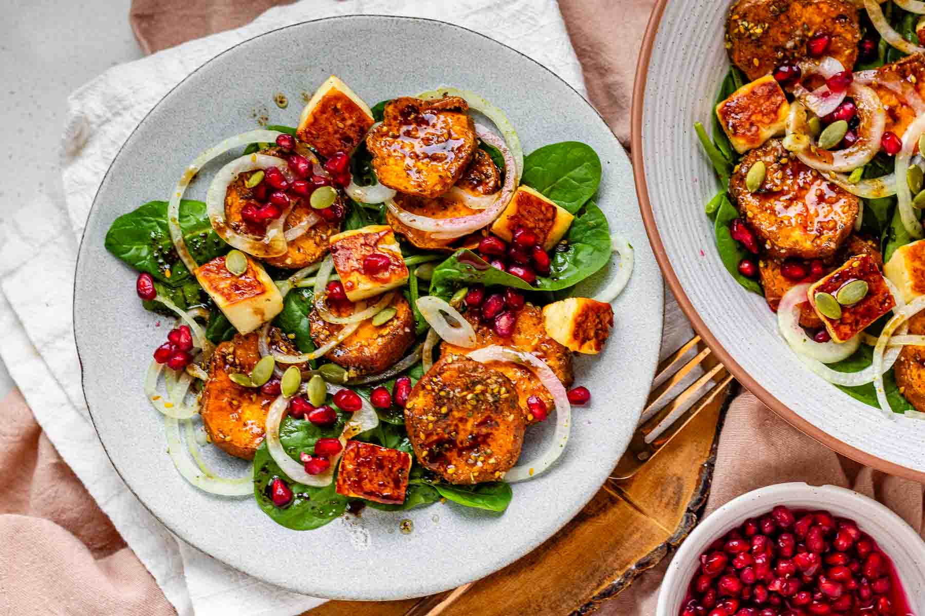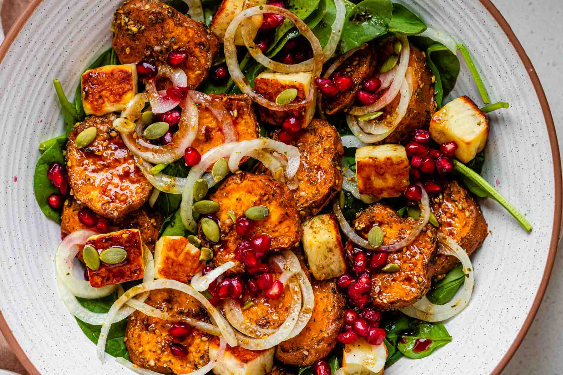 Salad kentang manis dan halloumi ini menggabungkan irisan kentang manis yang dipanggang, halloumi yang renyah dan dipanggang di oven, serta saus vinaigrette delima yang segar. Diberi bumbu za’atar, herbal segar, dan jeruk lemon, hidangan ini bisa menjadi hidangan utama atau pelengkap vegetarian.