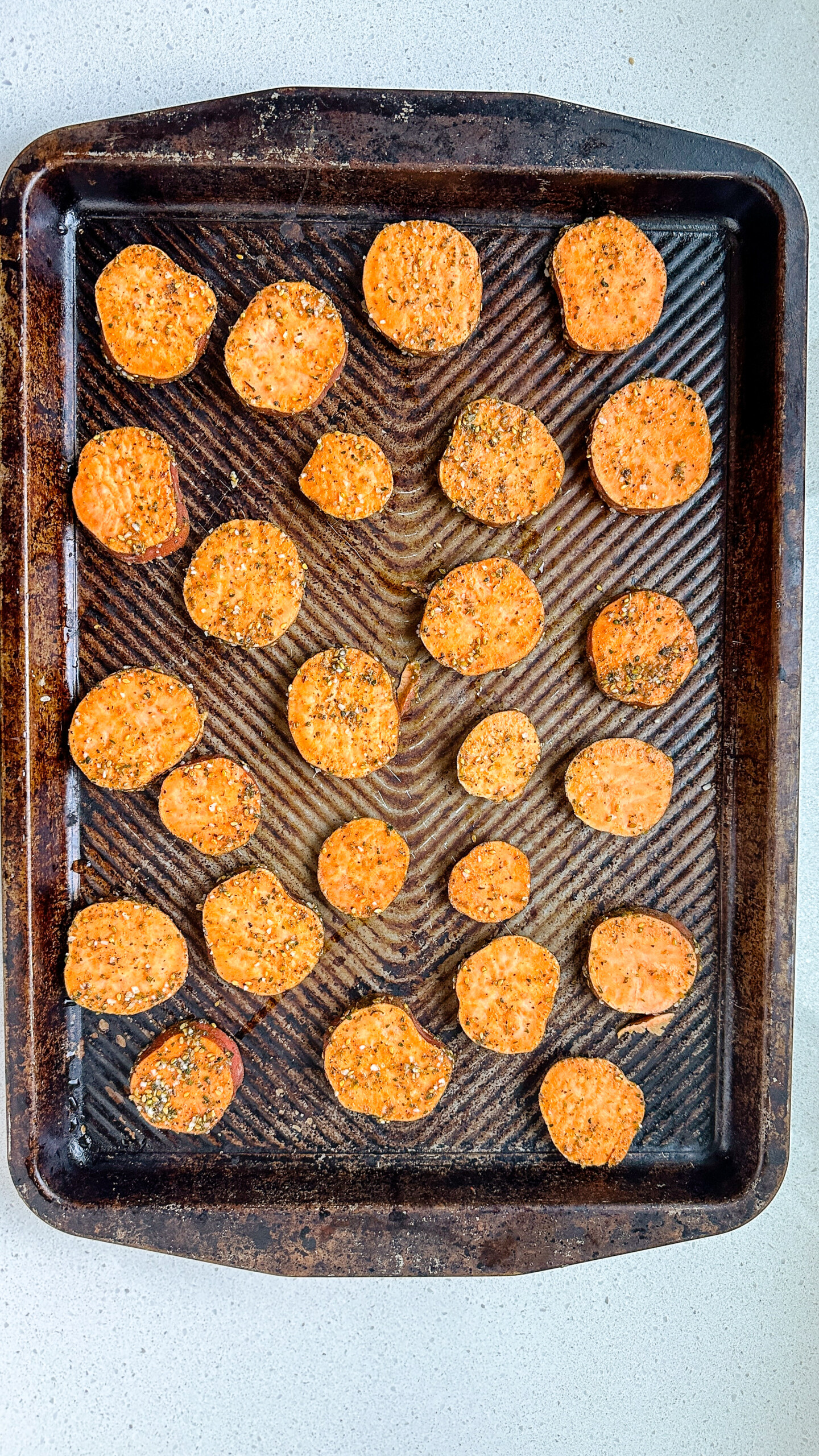 - Kentang manis: Gunakan dua kentang manis sedang, dipotong menjadi lingkaran setebal setengah inci. Ukuran ini membantu mereka dipanggang merata dan memberi tepi yang berwarna cokelat tanpa mengering.