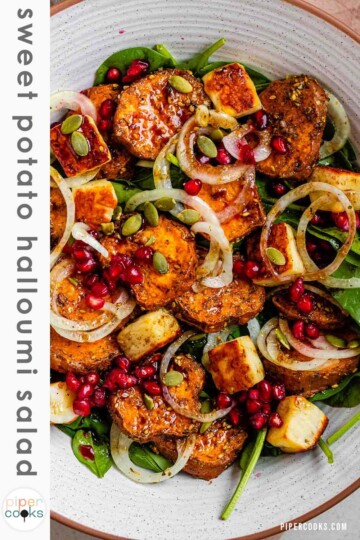 Salad kentang manis dan halloumi ini hangat, mengenyangkan, dan mudah dibuat dengan bahan-bahan sederhana. Kentang manis yang dipanggang, halloumi renyah, bawang merah acar cepat, dan saus vinaigrette delima bekerja sama untuk membuat salad yang seimbang yang bisa disajikan sebagai hidangan utama atau pelengkap sederhana.
