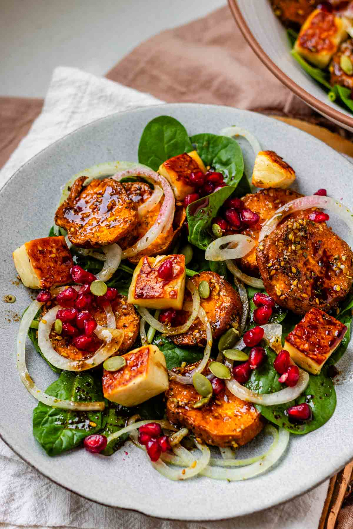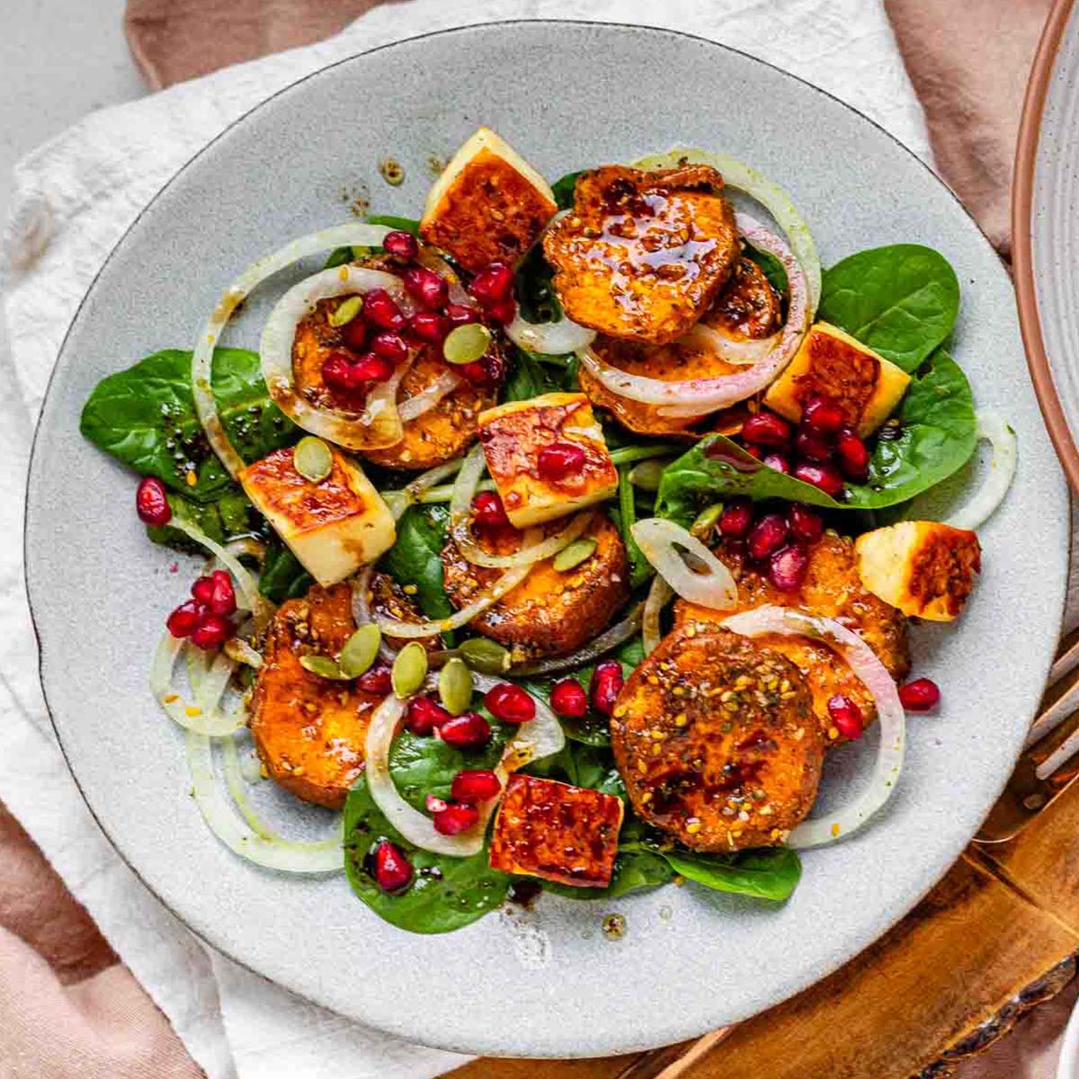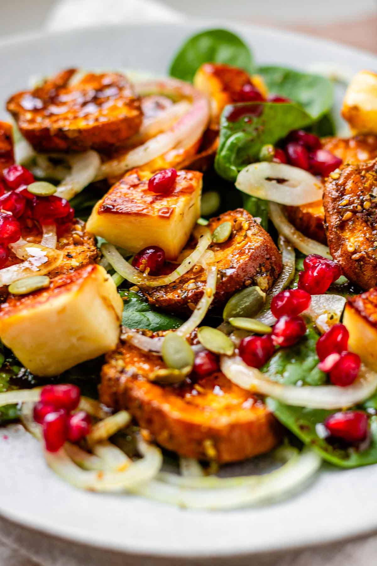 Buang air bawang bombai. Tambahkan bayam segar, kentang manis panggang, halloumi, dan bawang bombai ke dalam mangkuk besar. Tuangkan vinaigre dan aduk perlahan agar halloumi tidak hancur. Hias dengan biji delima dan biji labu.