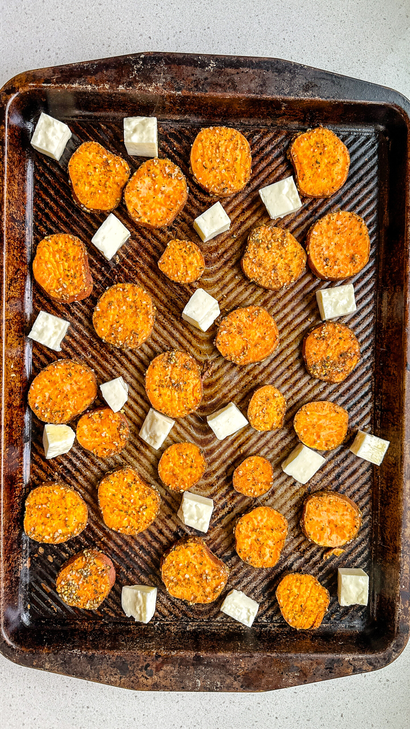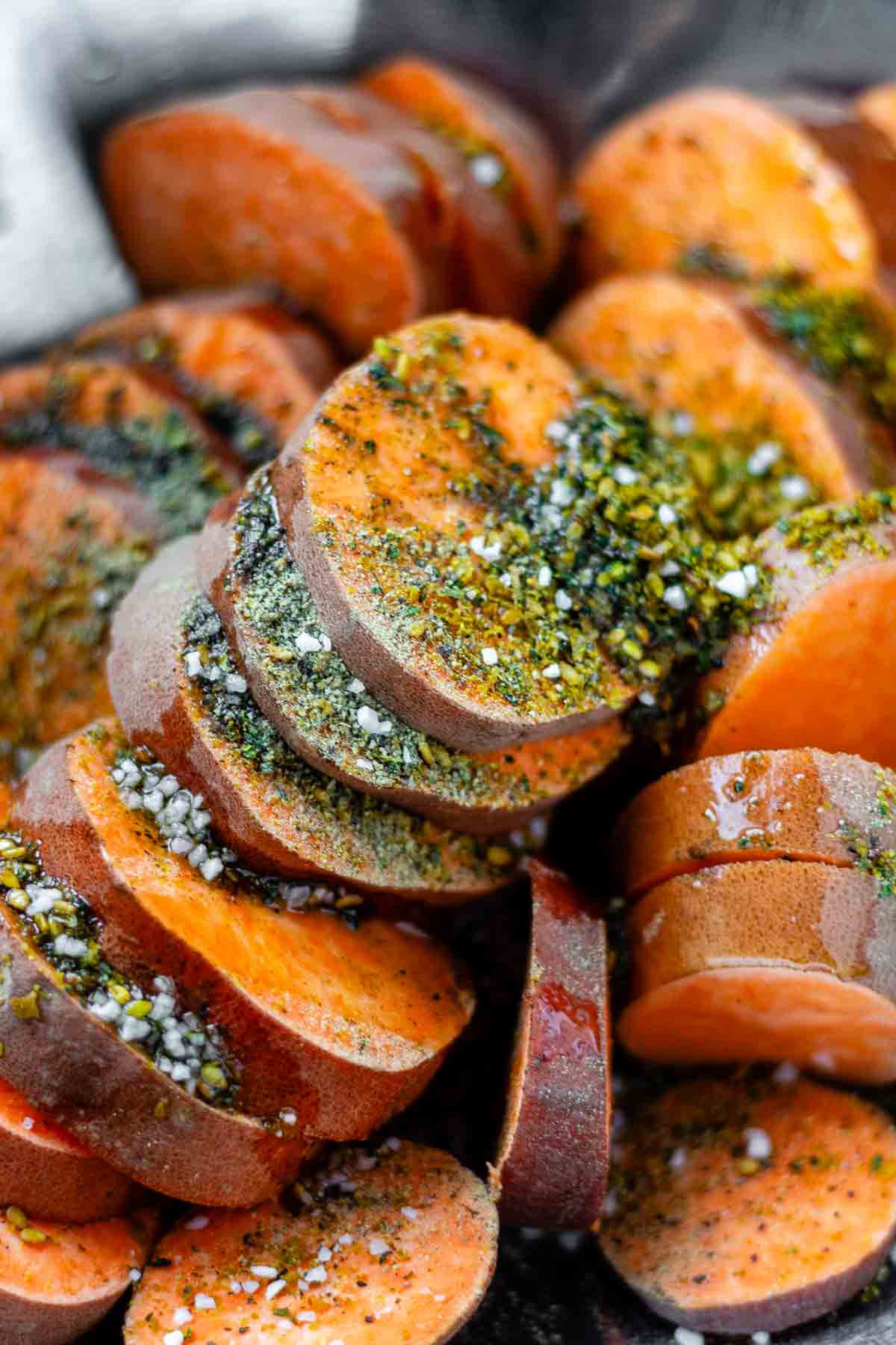 Tambahkan irisan ubi jalar ke dalam mangkuk bersama minyak zaitun, za’atar, garam, dan lada. Aduk hingga semua bahan terlapisi.
