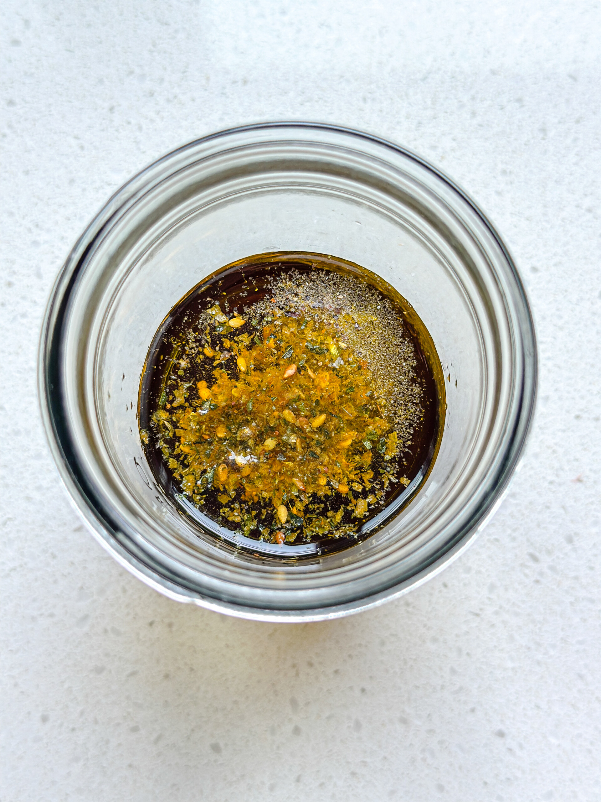 Masukkan minyak zaitun, molase granat, za’atar, garam, dan lada ke dalam toples kecil dengan tutup. Kocok untuk mencampur. Simpan sementara. Akan terpisah dan Anda perlu mengocoknya kembali sebelum digunakan.