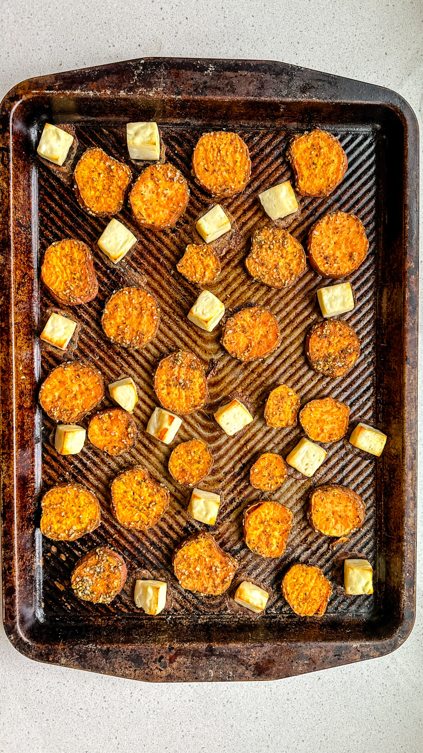Panggang selama 10 menit, keluarkan loyang dari oven dan tambahkan halloumi, letakkan di antara kentang manis. Kembalikan ke oven selama 15 menit. Kentang manis harus matang dan halloumi akan berwarna cokelat dan renyah di bagian bawahnya.