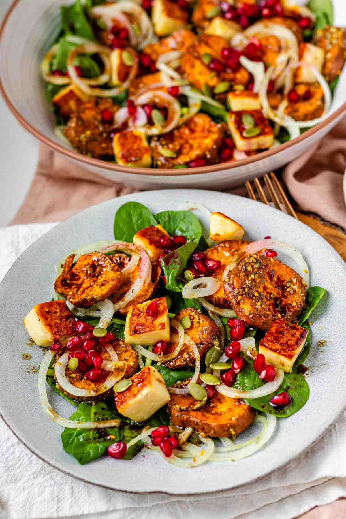 Salad Kentang Manis dan Halloumi ini adalah salad sayuran panggang yang dibuat dengan kentang manis berbumbu za’atar, halloumi panggang, dan saus vinaigrette delima sederhana.