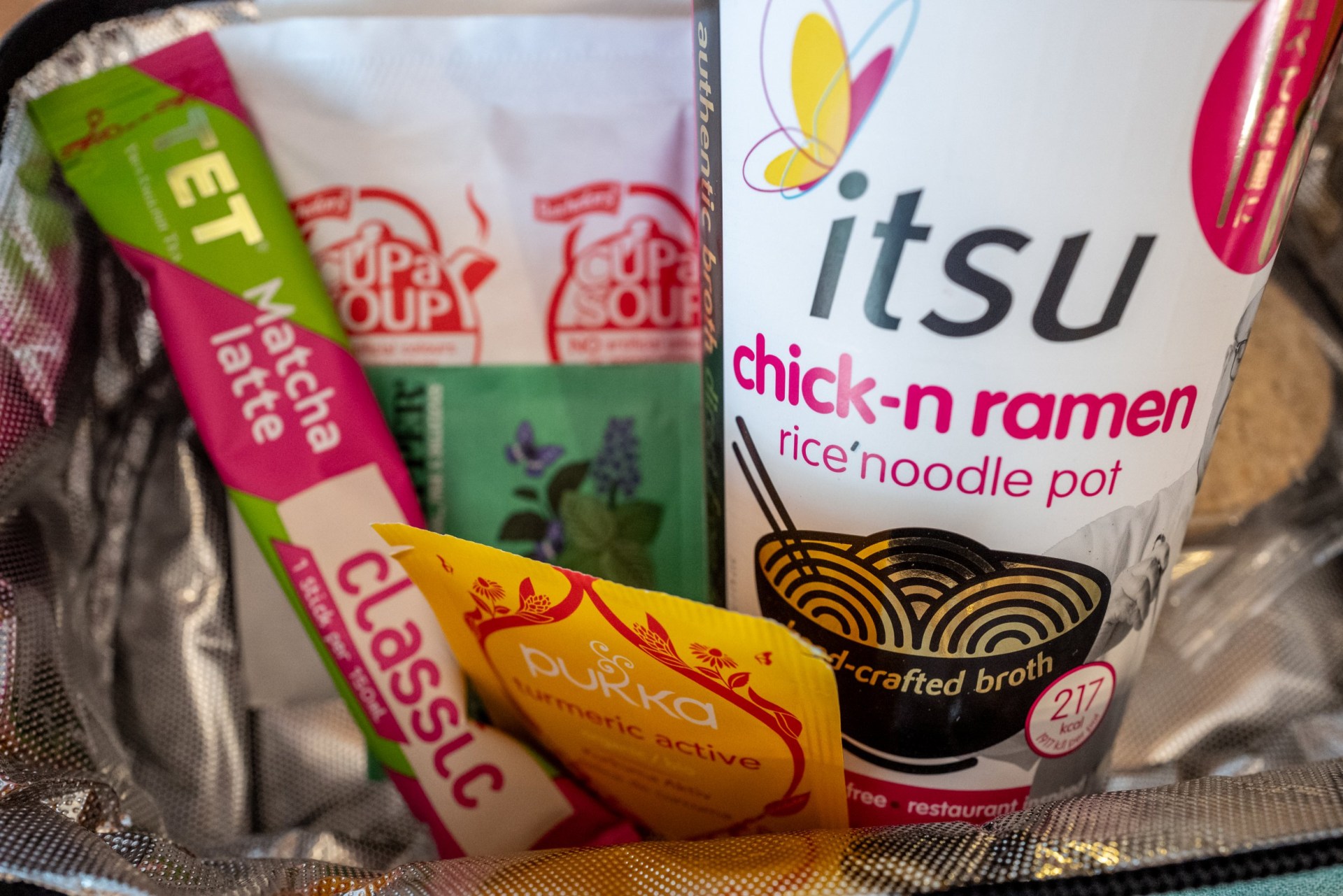 Anda harus berhati-hati dan memeriksa apa yang diizinkan dibawa melalui bandara dan pada penerbangan spesifik Anda, tetapi biasanya saya memilih hal-hal seperti sup kemasan, kantong teh, oatcakes, dan pot porridge instan.