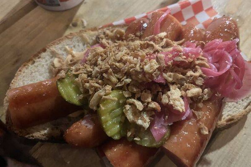 Saat sosis kami akhirnya tiba, mereka ditumpuk dengan bawang bombai asam dan timun asin. Mirip dengan sandwich terbuka Scandi, rasanya penuh dengan berbagai rasa, jauh berbeda dari hidangan perayaan yang biasa Anda temui di rumah.