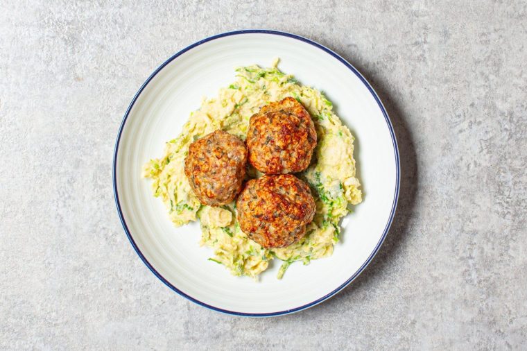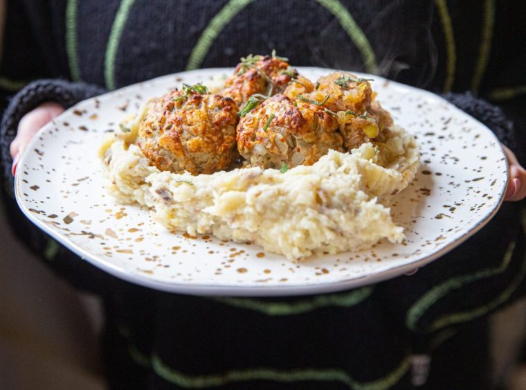Bagi puree ke dalam piring, letakkan meatballs di atasnya dan tuangkan saus cranberry di atasnya. Taburi dengan sage yang tersisa.